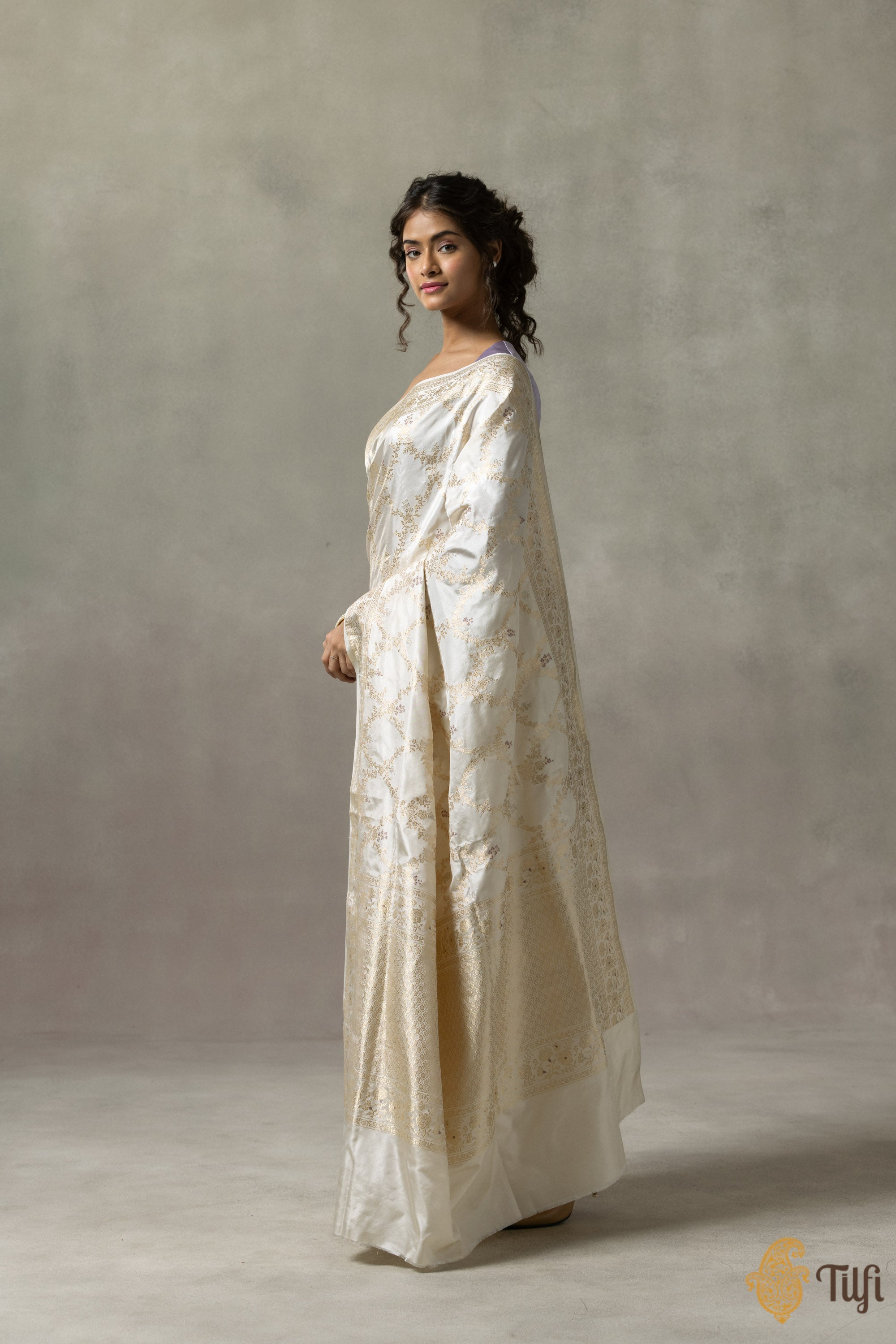 A lustrous Katan silk drape adorned with an ornate, subtly curvilinear roopa sona zari trellis pattern with hints of Meenakari florals, recalling the soft palettes and whimsical art of Rococo. Edged with delicately swaying flowers along the borders and finished with a detailed zari lattice on the pallu.