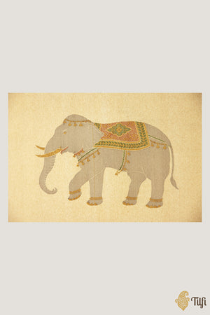 In this textile composition, the elephant's dignified instinctive movement is portrayed in magnificence, its form rendered with silk-tinted meenakari and woven with a deliberate, graceful hand. The composition is an ode to the stately gait of the elephant, a vision of royalty and refinement captured in Banaras’s artistic lexicon.