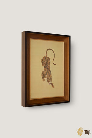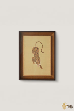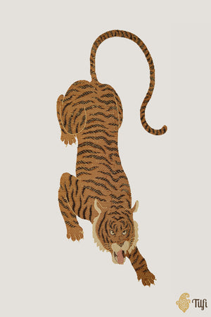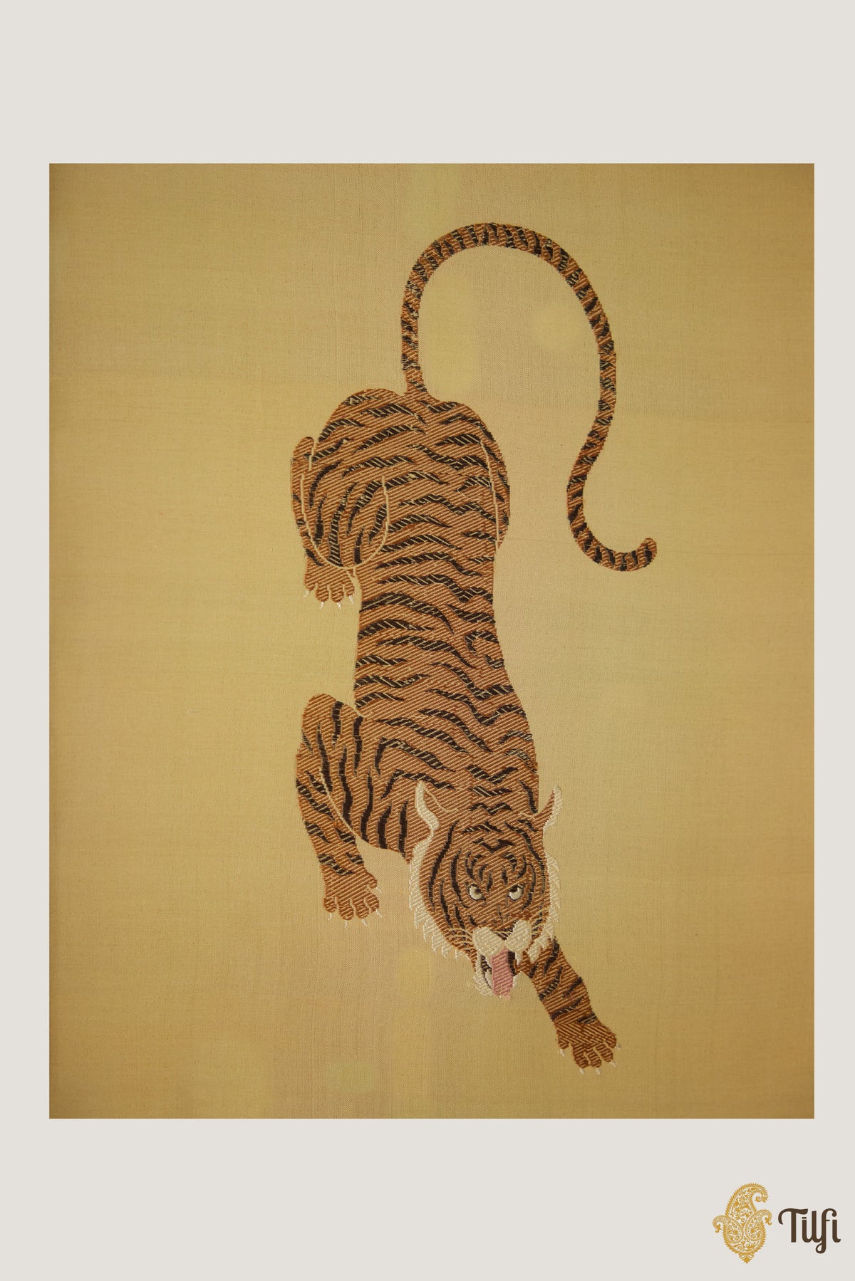 The tiger, majestic and indomitable, represents the epitome of strength, prestige, and military prowess. In this frame, the tiger emerges with regal authority, moving with calculated grace. Its form comes alive in resham threads on a canvas of silk tissue, immortalized in fine Banarasi craftsmanship.