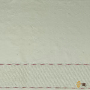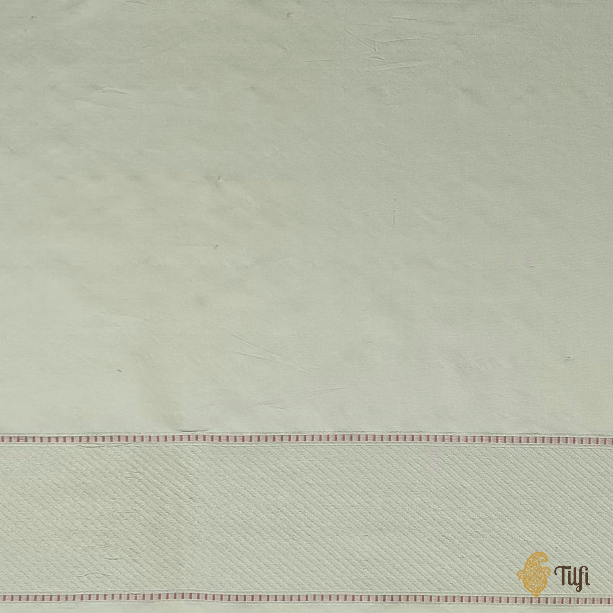 A pure Katan silk saree in a soothing white. Handwoven with fine silver zari vasket art in all-over floral patterns on the body, and completed with a contrasting selvage for a delicate accent.
