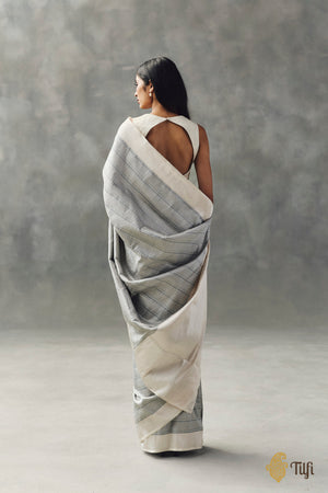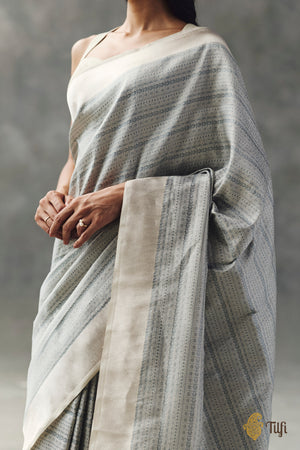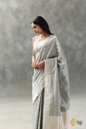 A chic Banarasi adorned with a carefully crafted vertical tanchoi weave on a lustruous base of katan silk tissue fabric: an enduring handloom treasure.