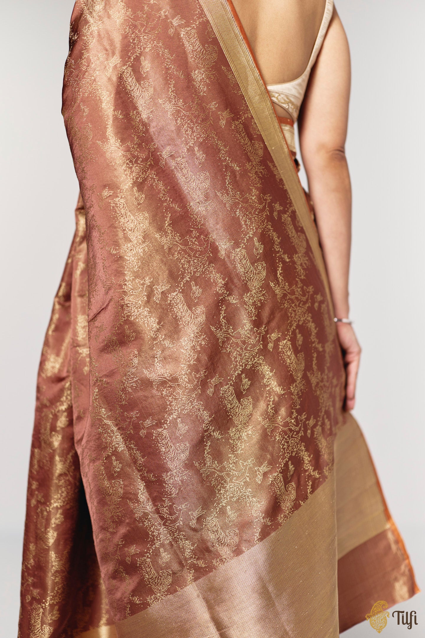 A tapestry with the poetry of a winter landscape, the saree celebrates the beauty of the jungle in a contemporary woven scape. Tigers, birds, leaping deer, and floral accents unfold in delicate motifs to capture the motion of nature in the poise of the loom. A celebration of nature's joy in a weave that catches the light.