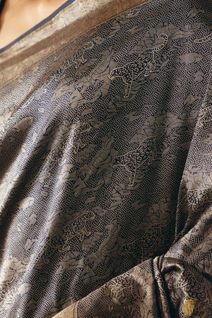 A frozen whisper from the high Himalayas, this saree mirrors the quiet camouflage of the elusive snow leopard. Intricate zari motifs of snow and stone merge into spotted forms, evoking a delicate harmony between wilderness and weave. From rocky terrains, leopards emerge in motion across the canvas, while the pallu captures the jagged geometry of mountain ranges in exacting detail.
