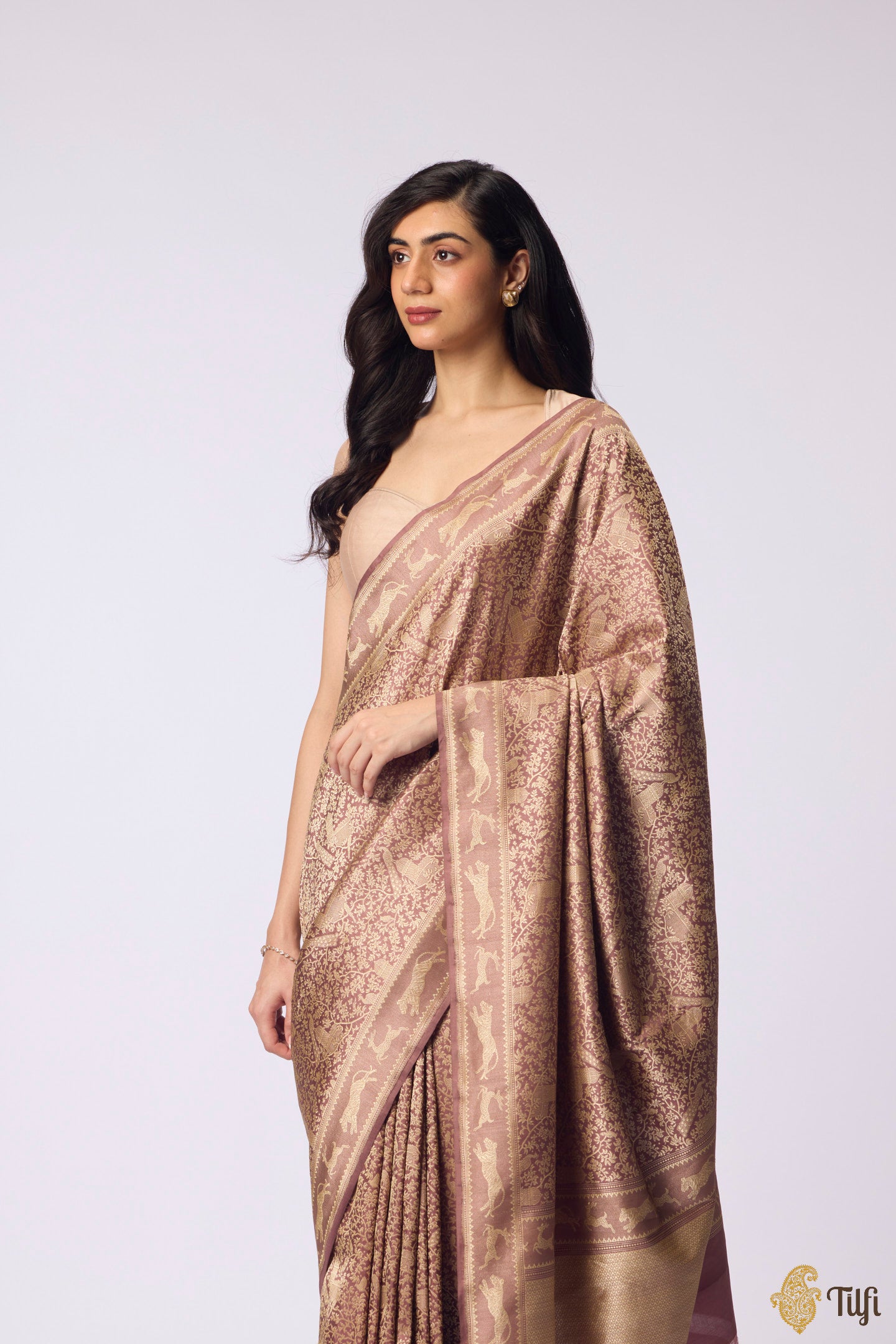 Collection note - Rooted in the grandeur of Ranthambore Fort and the wilderness it now crowns as a national park, this series reimagines the Shikargah in intricate Zari Vasket weave. Tigers, deer, and peacocks converse with pavilions, ramparts, and florals in drapes that unite heritage regality with the vitality of the wild. Each saree is a woven homage to Ranthambore, where architecture and nature, stillness and pursuit, meet on silk.