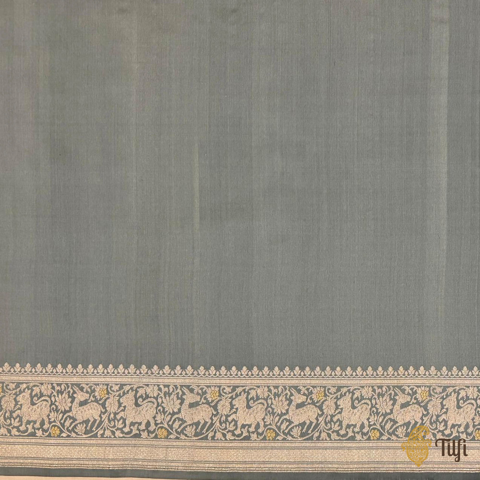 An ode to a storied Banarasi tradition, this saree features a classic Shikargah border, where scenes of royal jungles unfold in intricate detail. Woven in sumptuous silk, its understated body allows the heritage motifs of deer and tigers take centre stage.