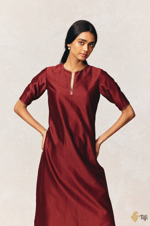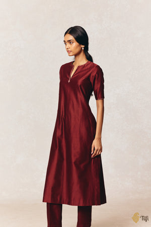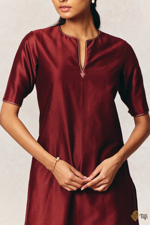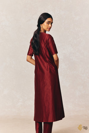 A straight-fit silk-cotton kurta in a dark maroon, designed with elbow sleeves and a split crew neckline. Embroidery traces the neckline and sleeve edges with quiet precision, while a stylised Tilfi paisley is hand-embroidered just below the opening. Paired with straight-fit pants, the ensemble embodies effortless refinement.