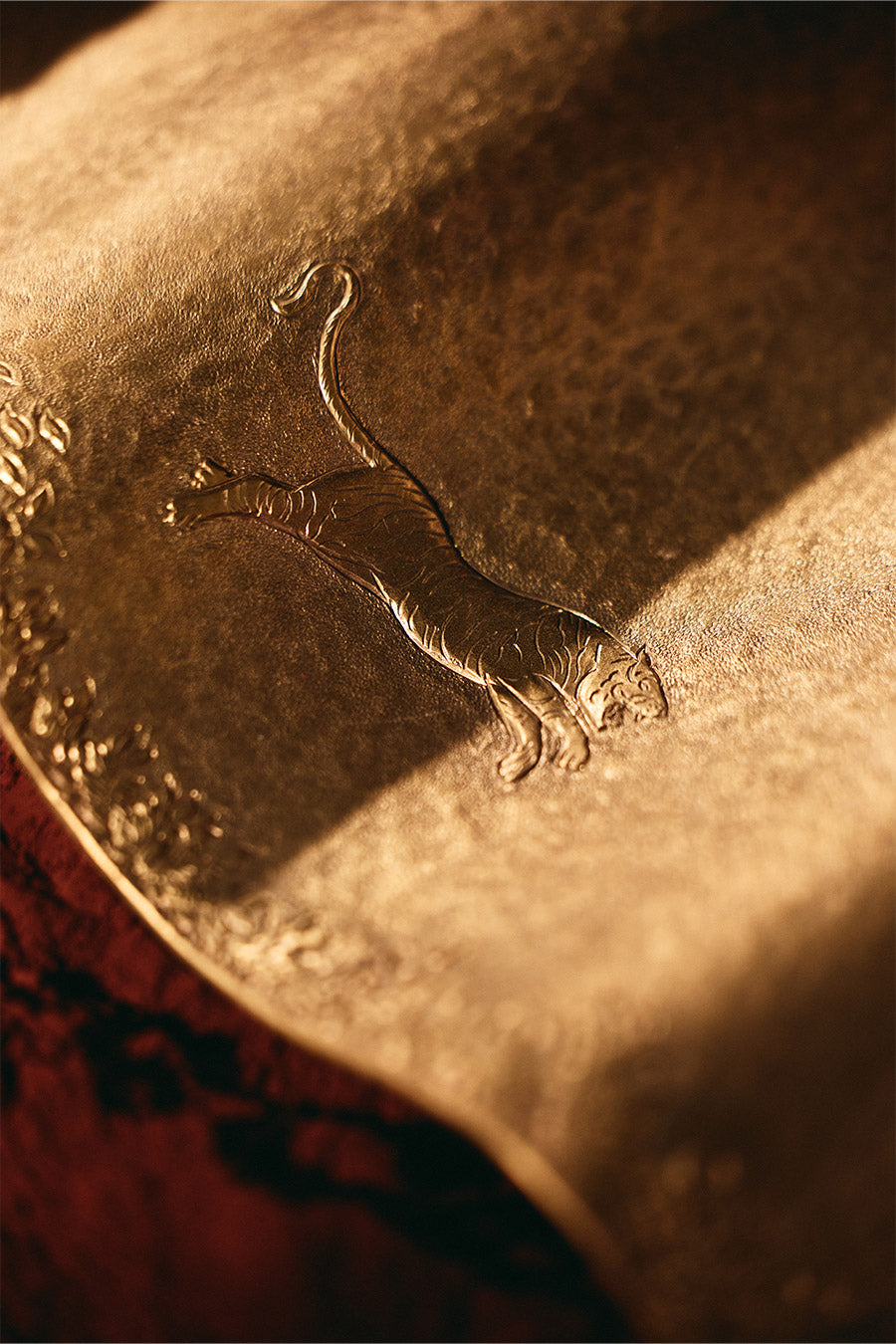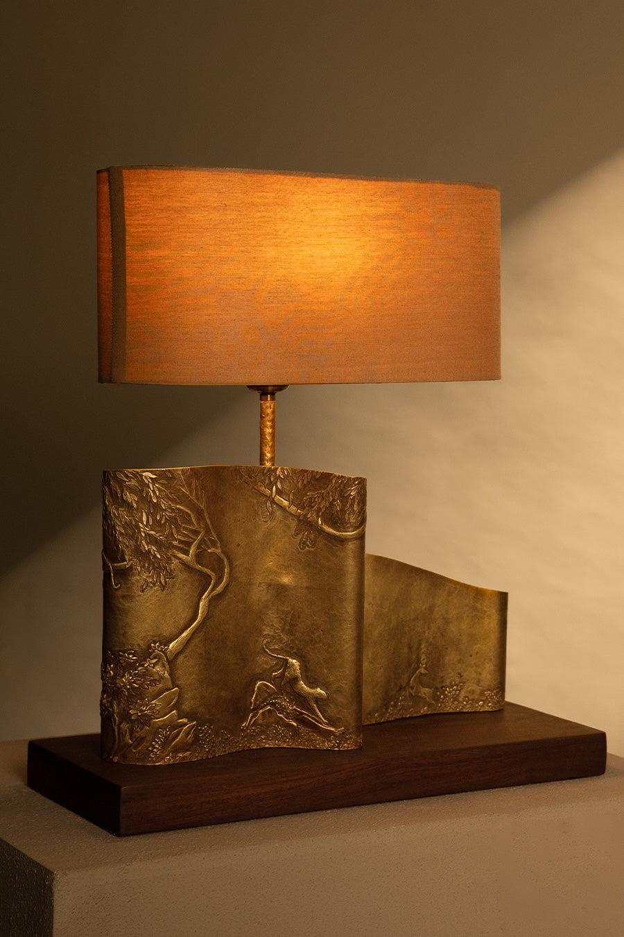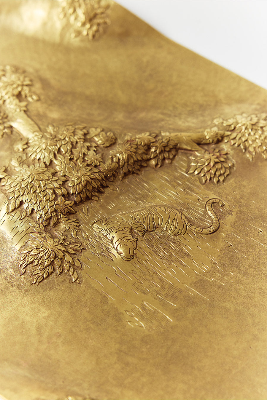 Scenes of tigers, deer, birds, and foliage unfold across the surface, moving beyond ornamentation into a thoughtful dialogue between form and function. Undulating planes recall the terrain of the wild, while flat surfaces lend themselves to utility. These creations exist at the confluence of art, craft, and design — singular objects of beauty and purpose that embody Tilfi’s sensibility of inheritance and reinvention.