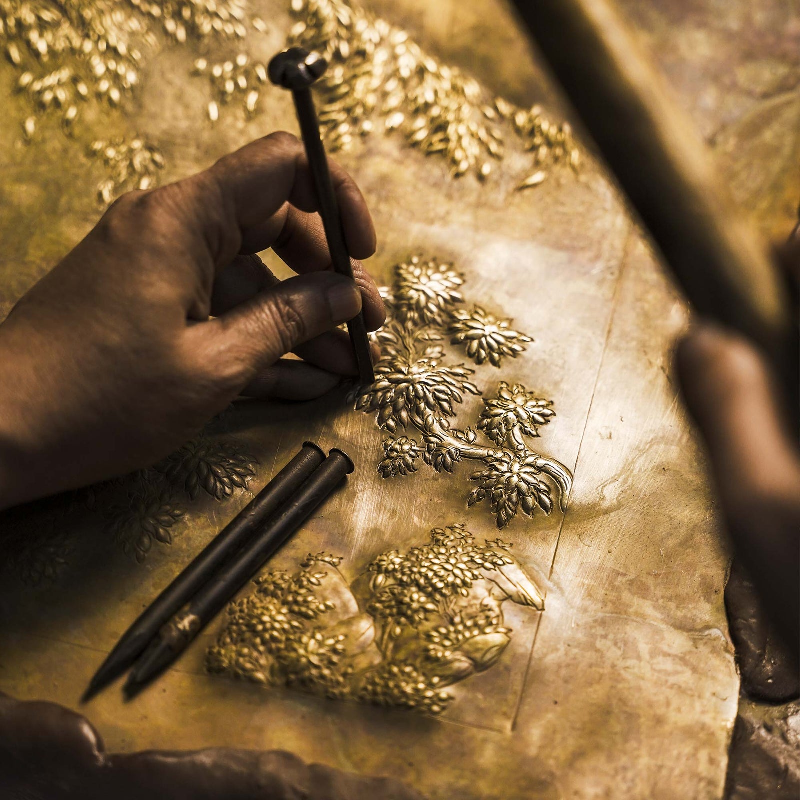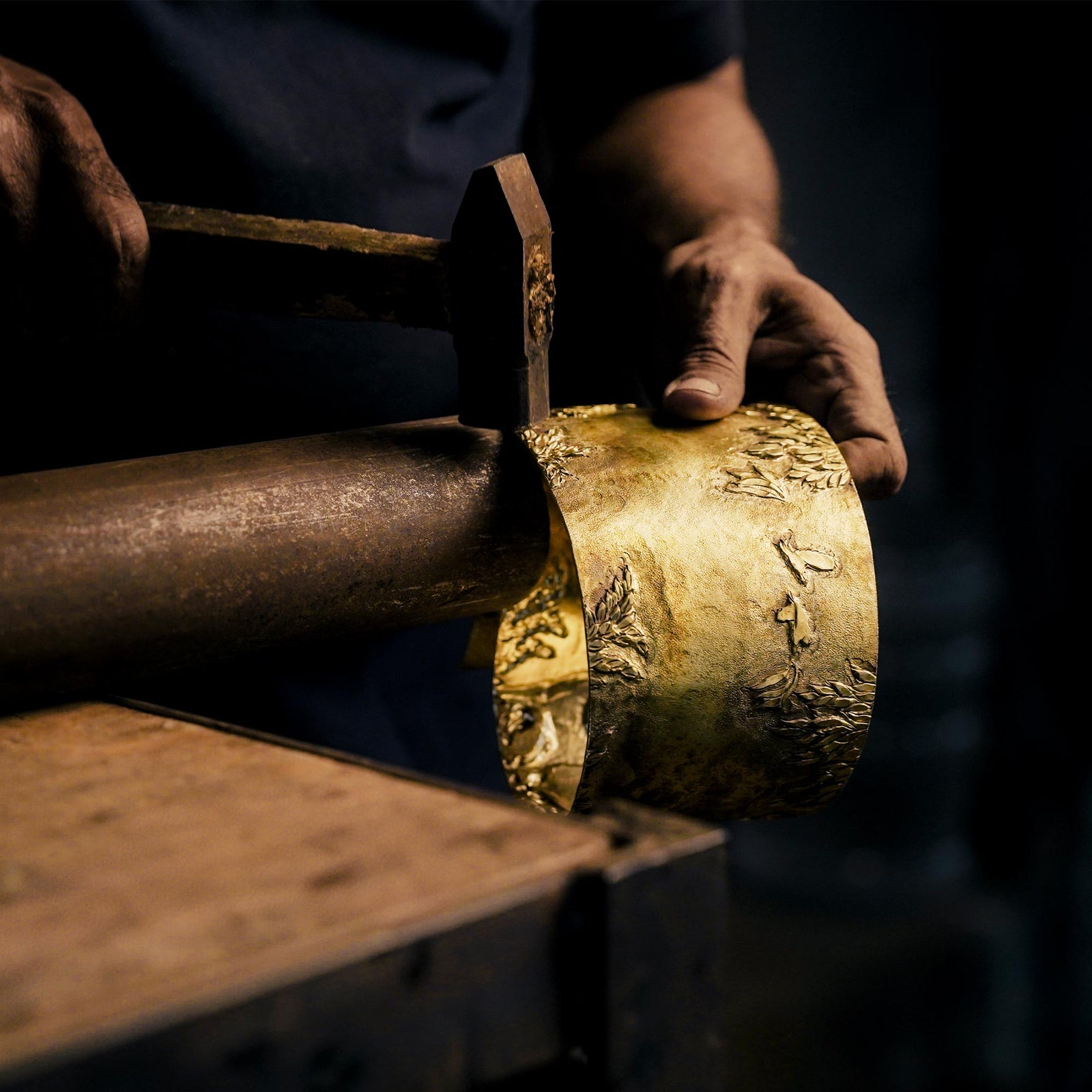 Tilfi’s engagement with metal repoussé goes beyond preservation and stands as a testament to unparalleled skill and precision. Entirely handmade, the process involves meticulously hammering metal from the reverse to create precise, raised patterns. With each strike, the artisans breathe life into the metal layer by layer. This slow, meditative technique requires countless rounds of embossing and embodies patience, mastery, and beauty, woven into Banaras’s storied history.