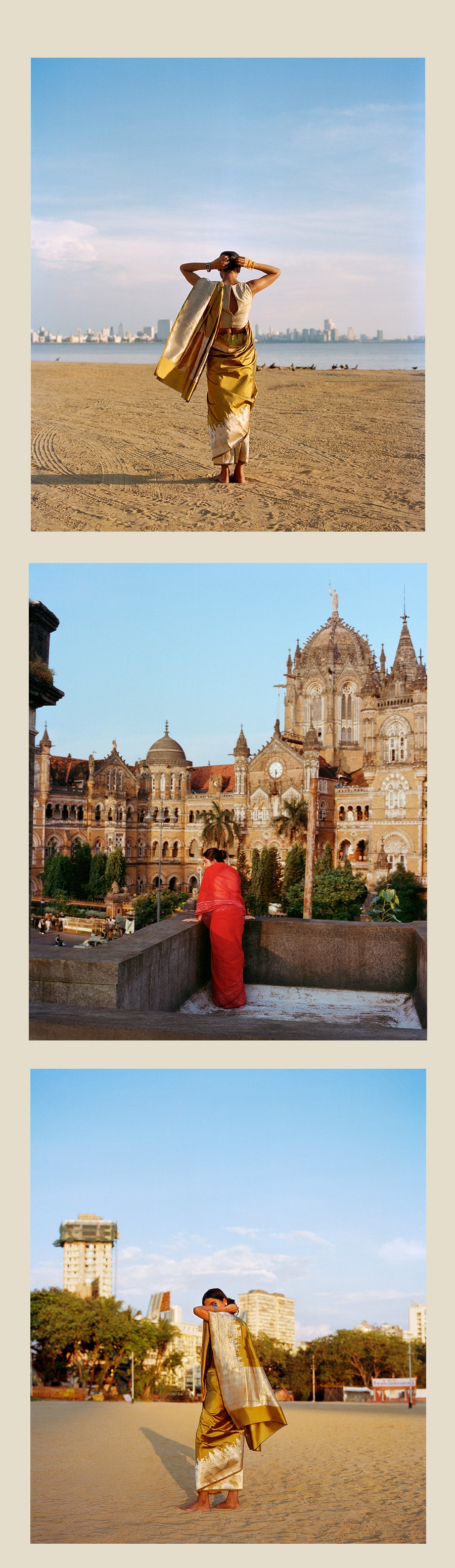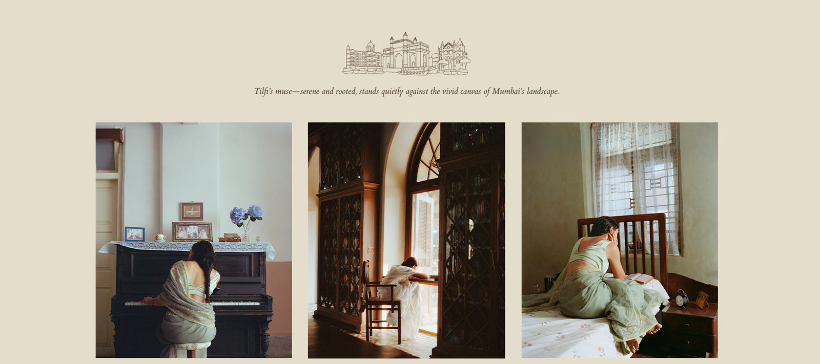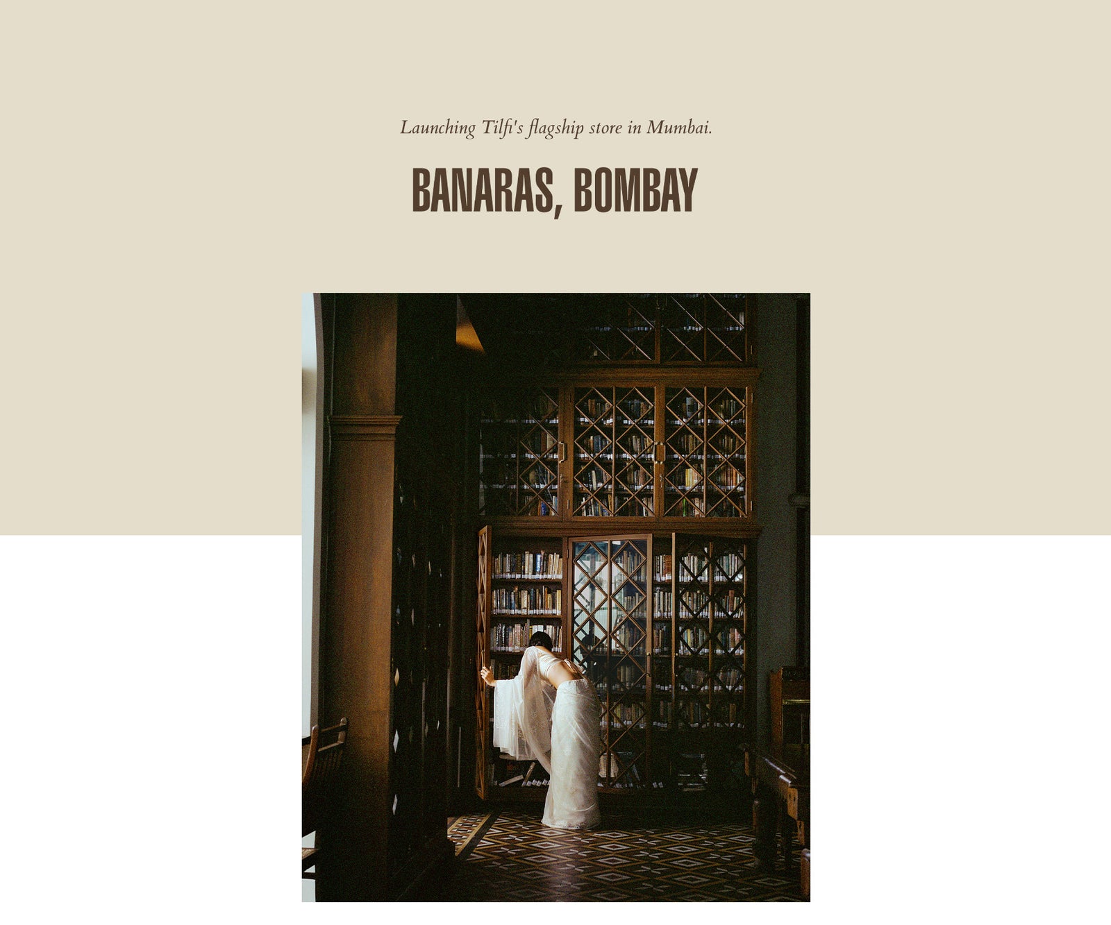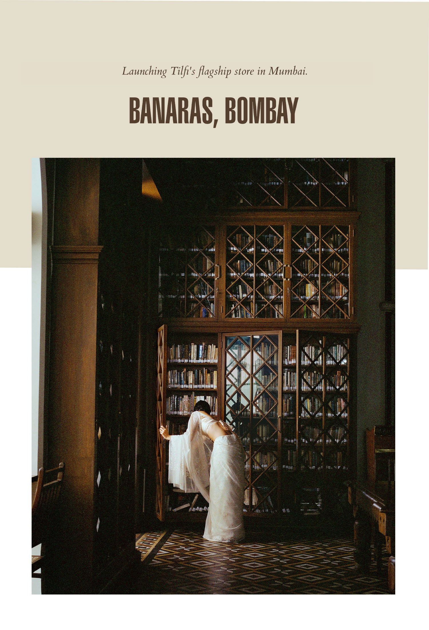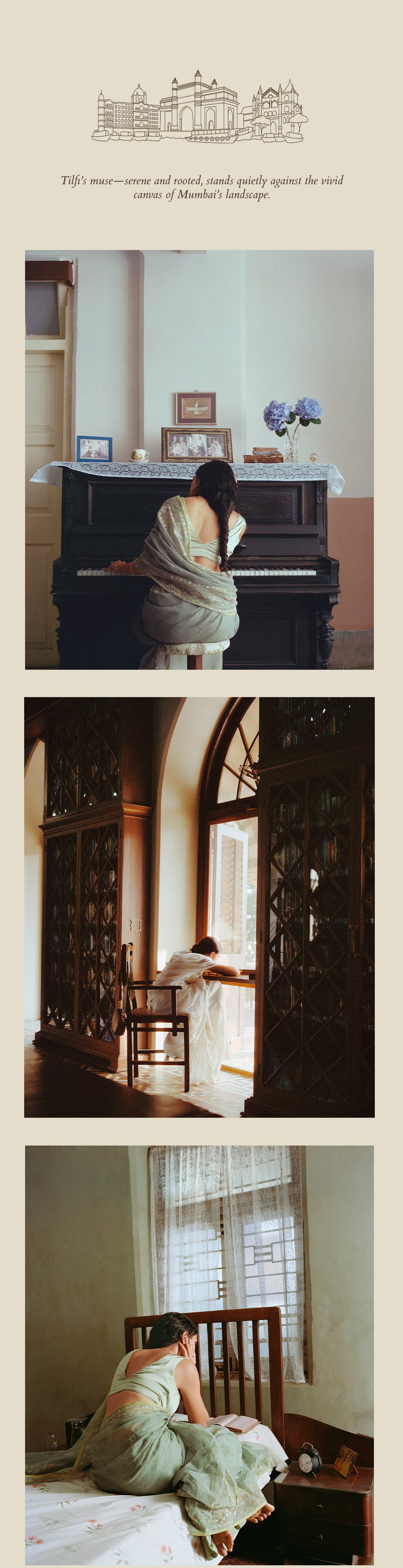 Embodying a serene oasis within the city’s constant tide, Tilfi’s muse finds unspoken poetry, embraced by the beauty of Mumbai’s enduring heritage as time moves forward. Draped in Tilfi’s elegance, she reflects the timelessness of Banaras within the heart of Bombay—a confluence of two worlds where the reverence of one city harmonizes with the pulse of another.