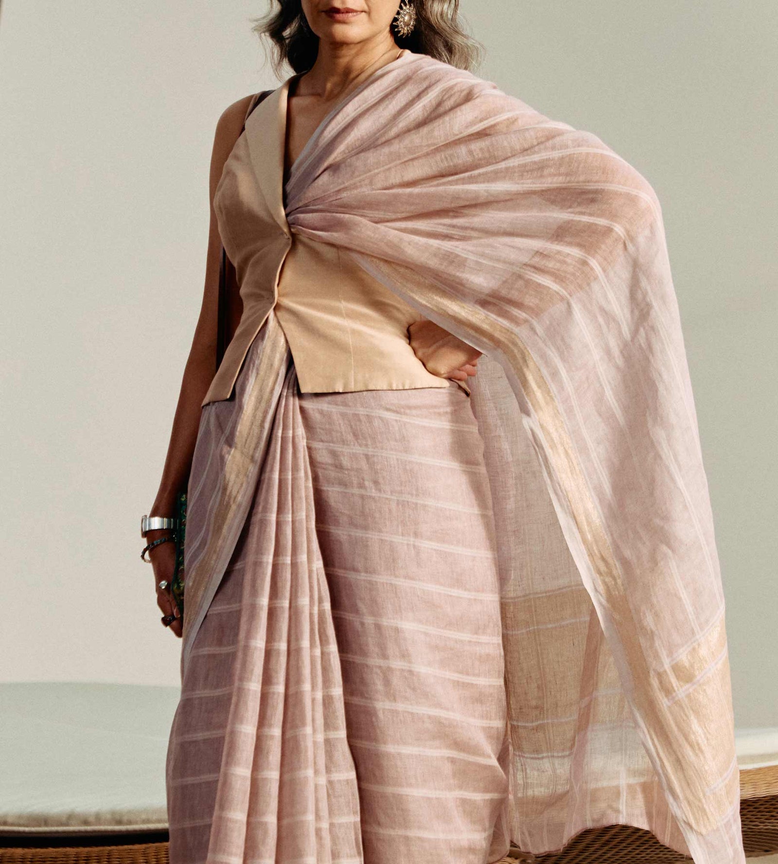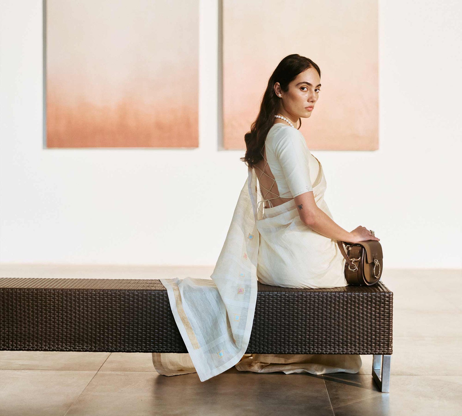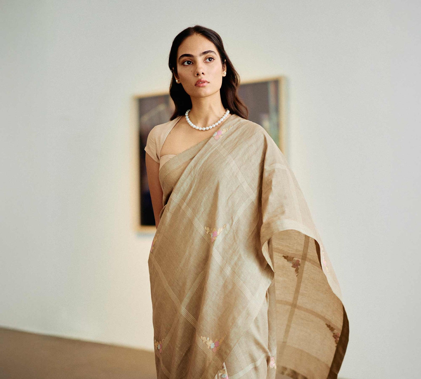 Introducing a collection of patterned linen and cotton-by-linen sarees, Intersections marries the quiet tactility of linen fibre with the technical and aesthetic language of Banarasi handloom.