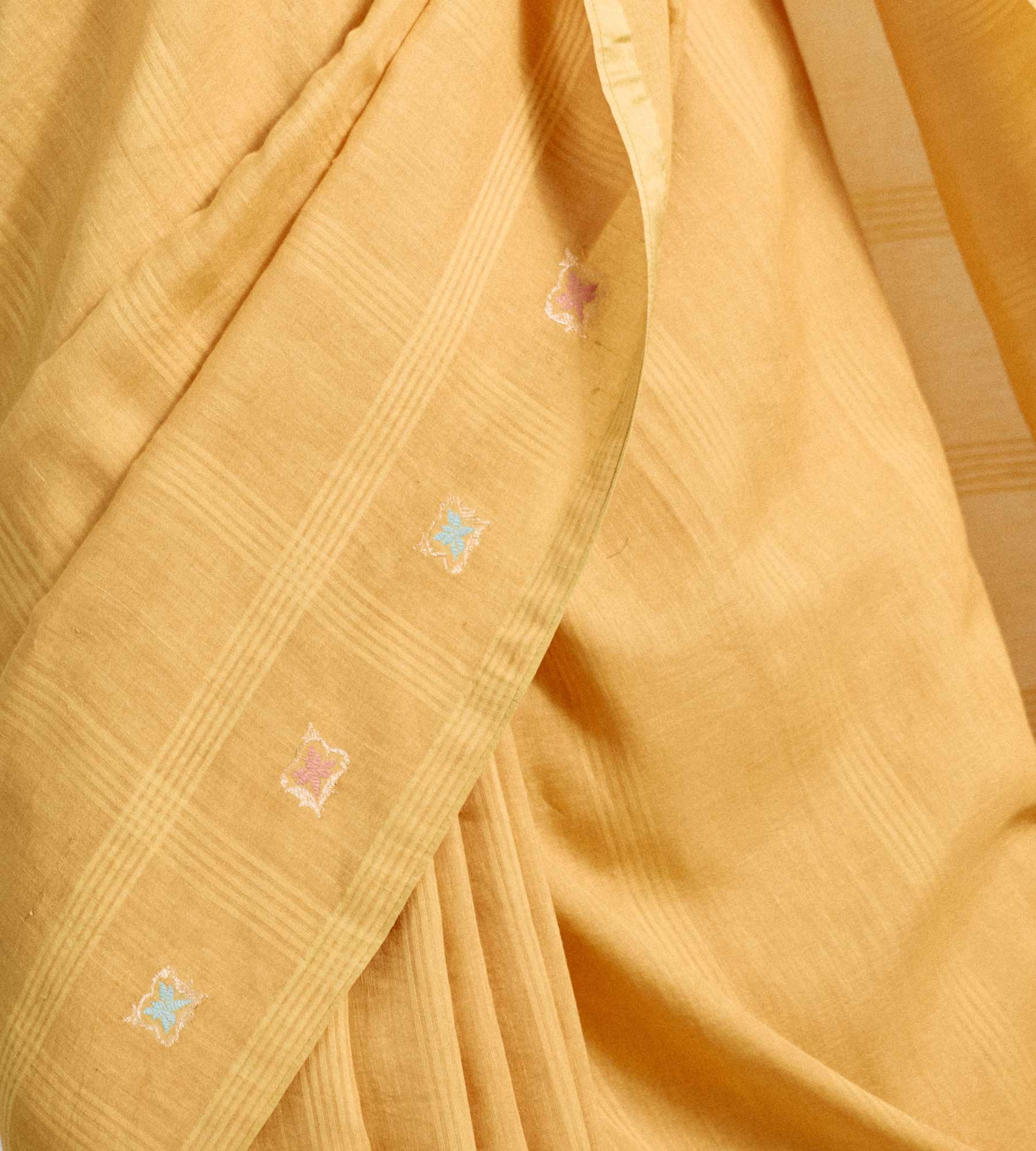 In Intersections, this negotiation between fibre and hand has yielded four sarees whose patterns (stripes, checks, and floral accents), carry the geometry of the loom, softened by the material’s lived-in ease.