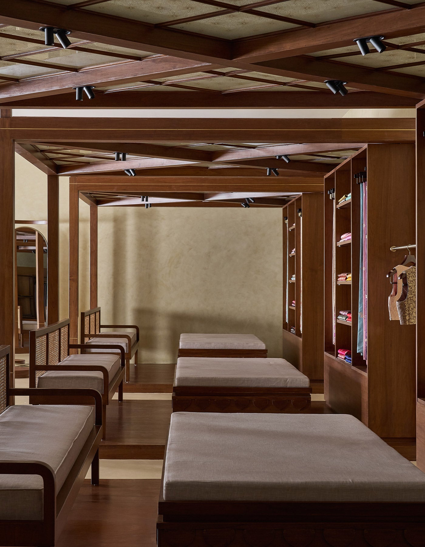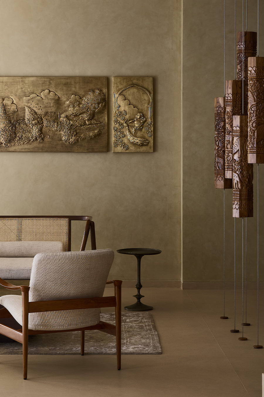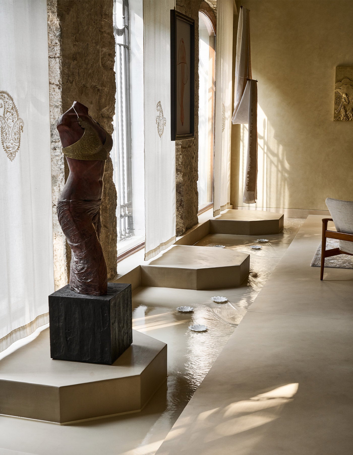 The earthy buff palette of the space is reminiscent of the sandstone buildings that line the ghats of Varanasi, an ode to the architectural richness of Banaras. Along the periphery, tranquil water channels flow serenely, evoking the soft ripples of the Ganges.
