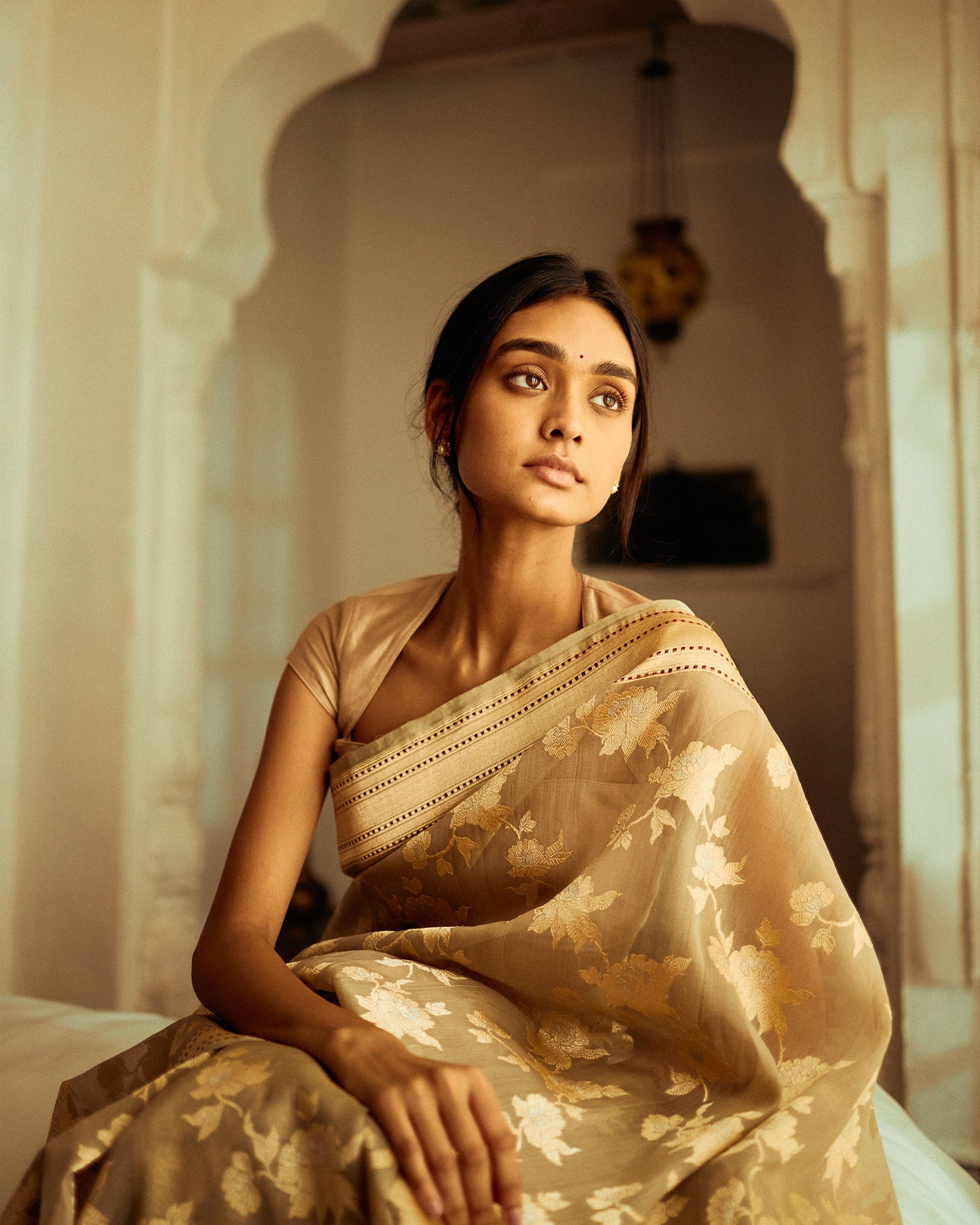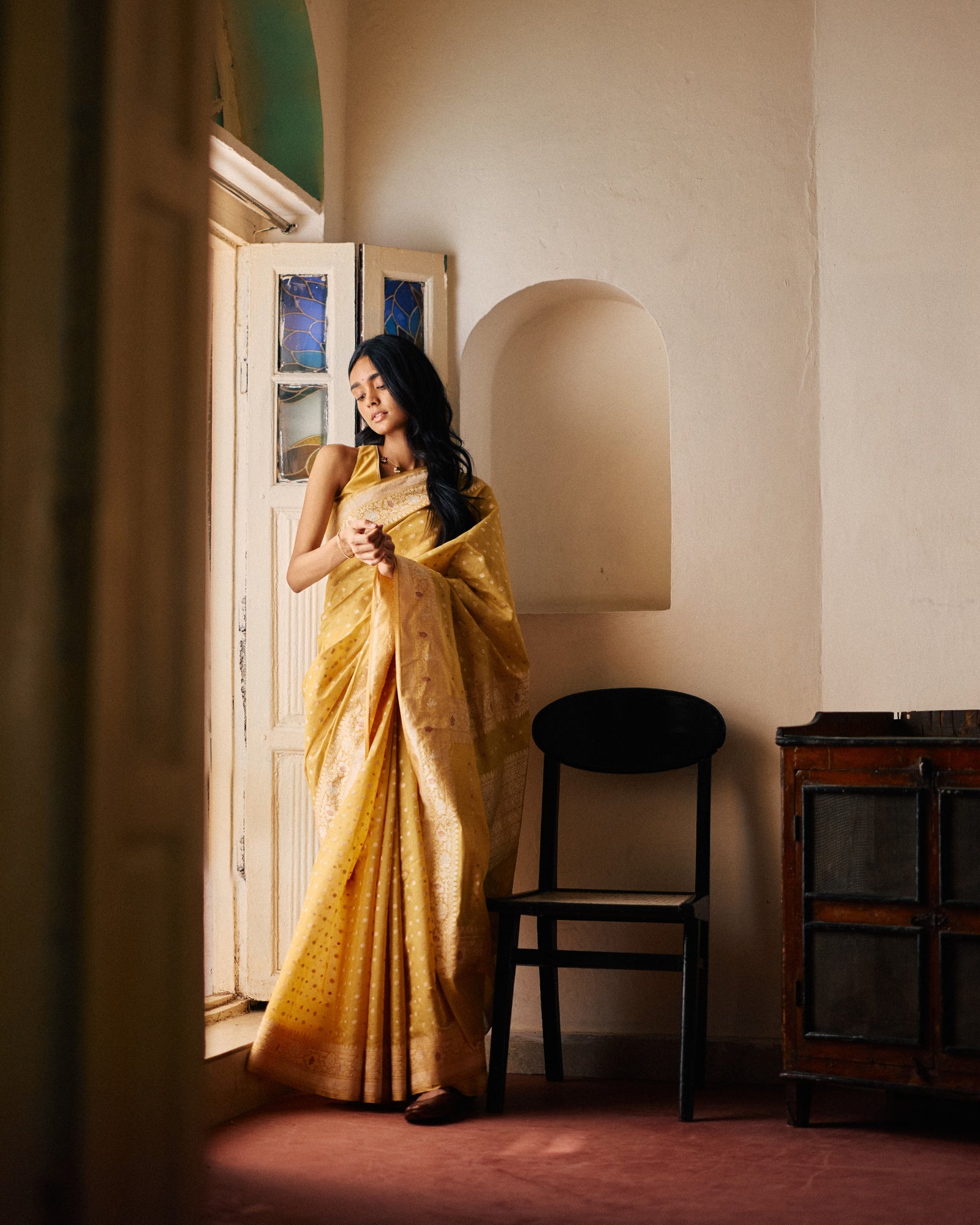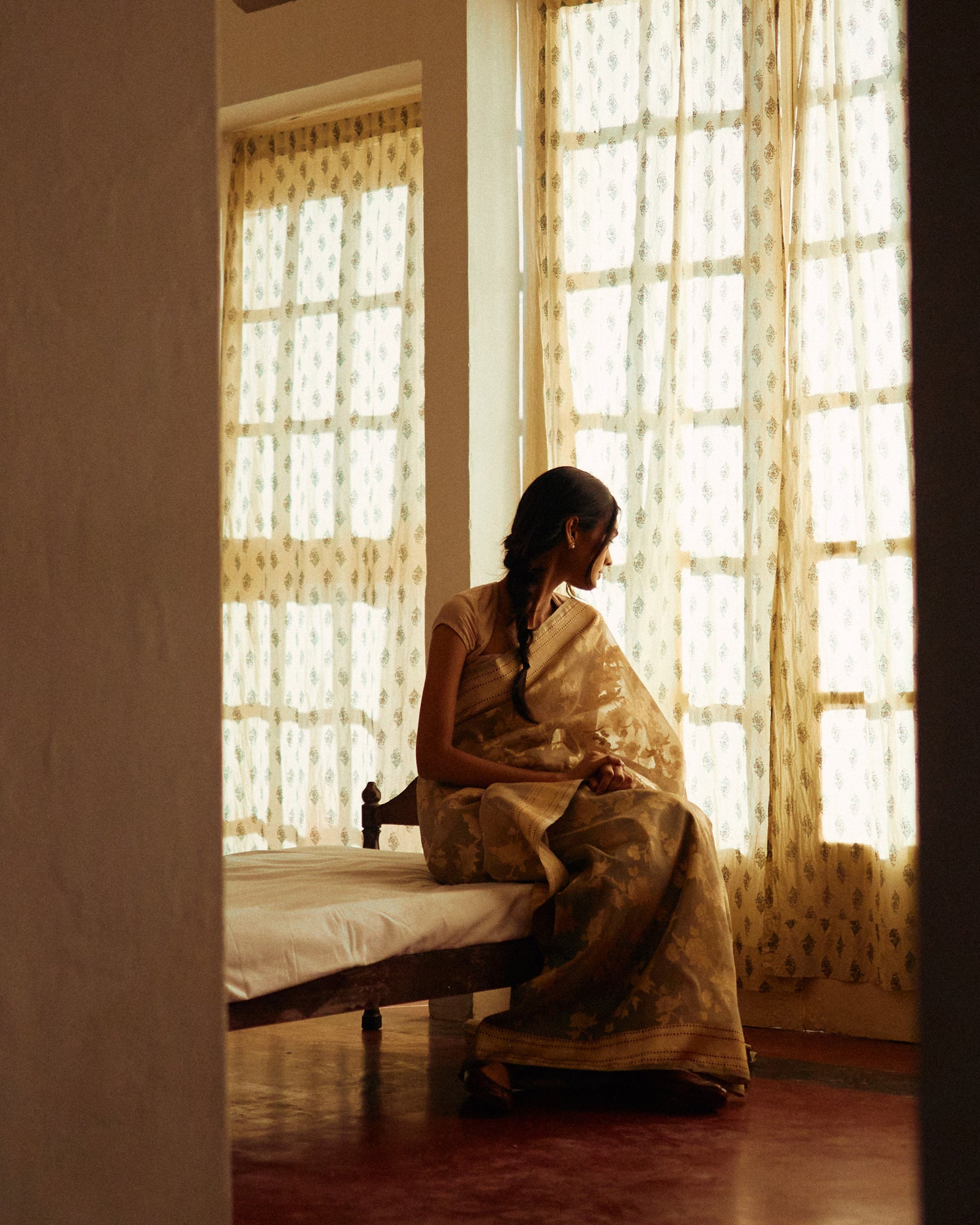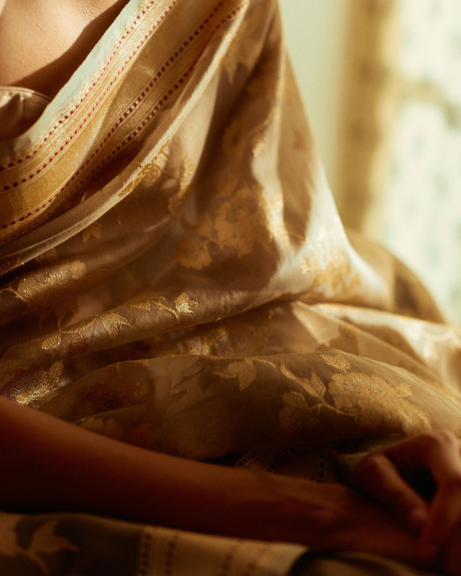 A capsule of six handwoven creations, each bearing the imprint of classical design, woven in Banaras using heritage techniques of exceptional finesse. Crafted in Kora silk and its diaphanous tissue variants, the collection celebrates the airy grace and archival complexity of museum-grade weaving.