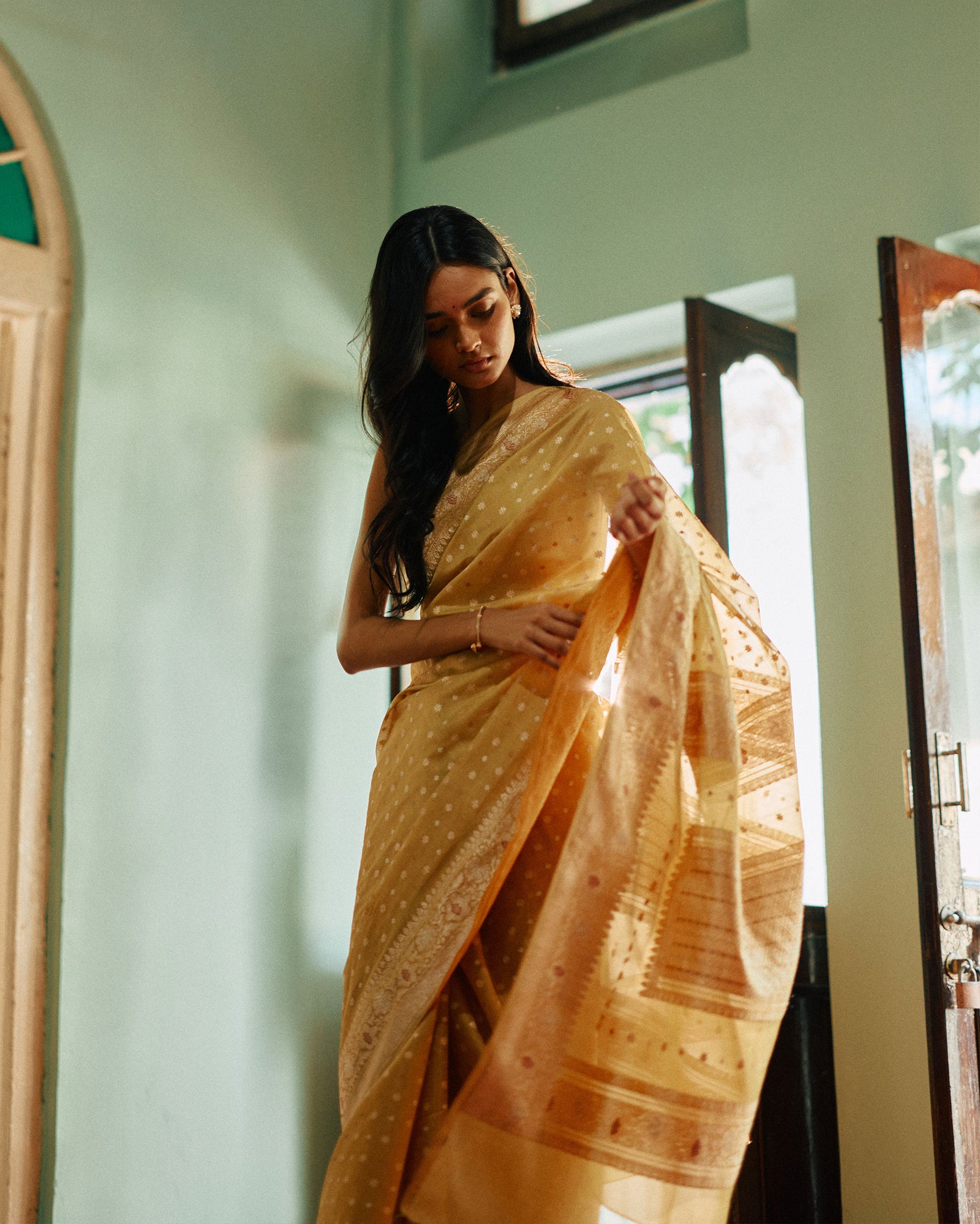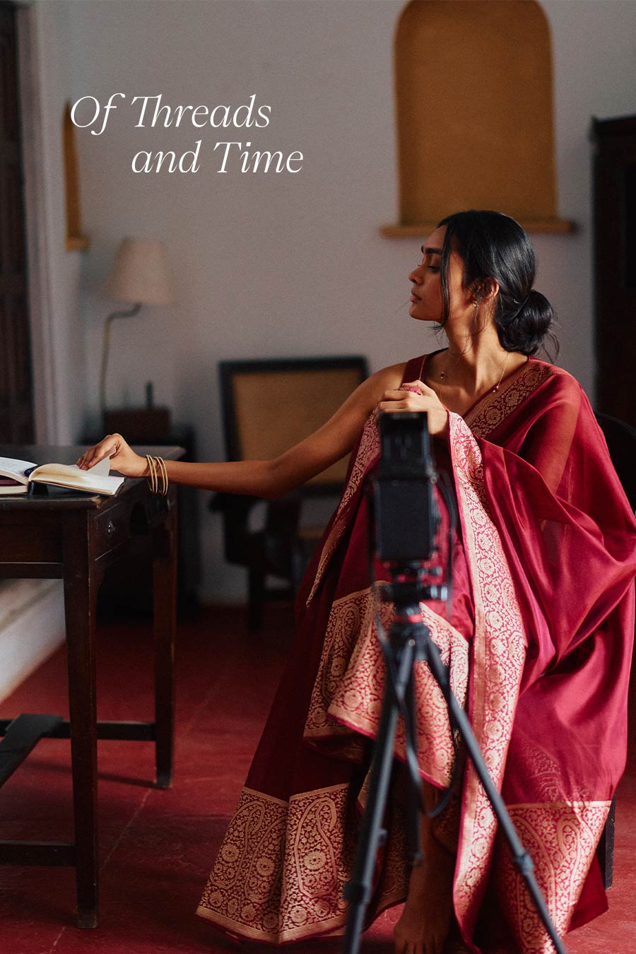 Of Threads and Time, is an ode to the delicacy of Kora silk, the inheritance of craft, and the quiet continuity of tradition. Gathering sarees that trace the arc of heritage through thread, legacy, and timeless design.