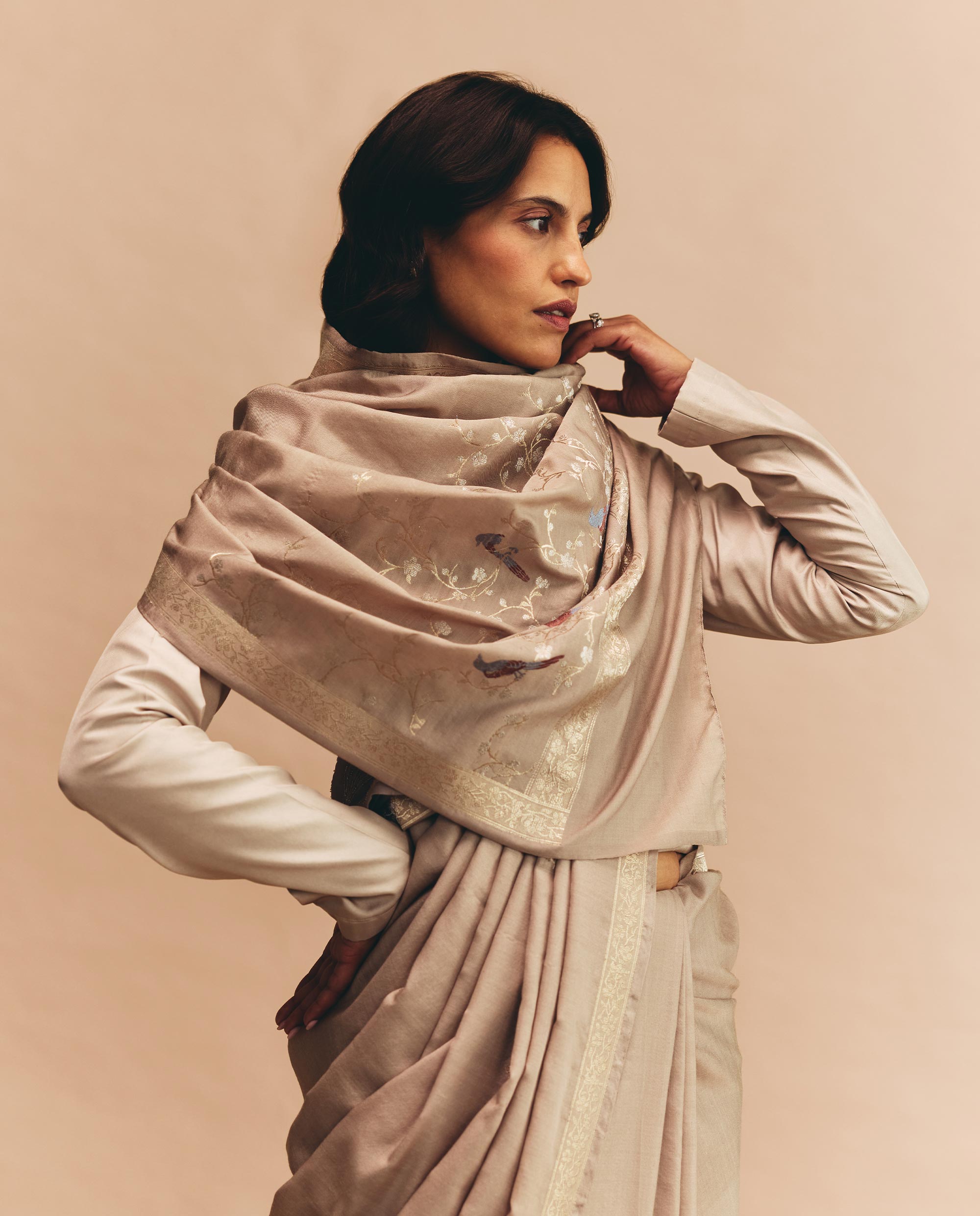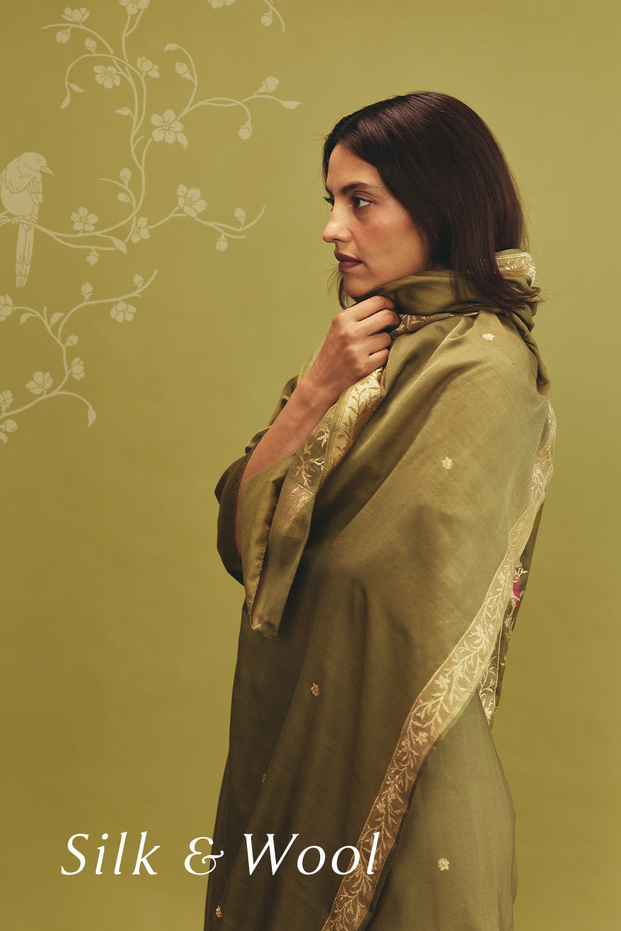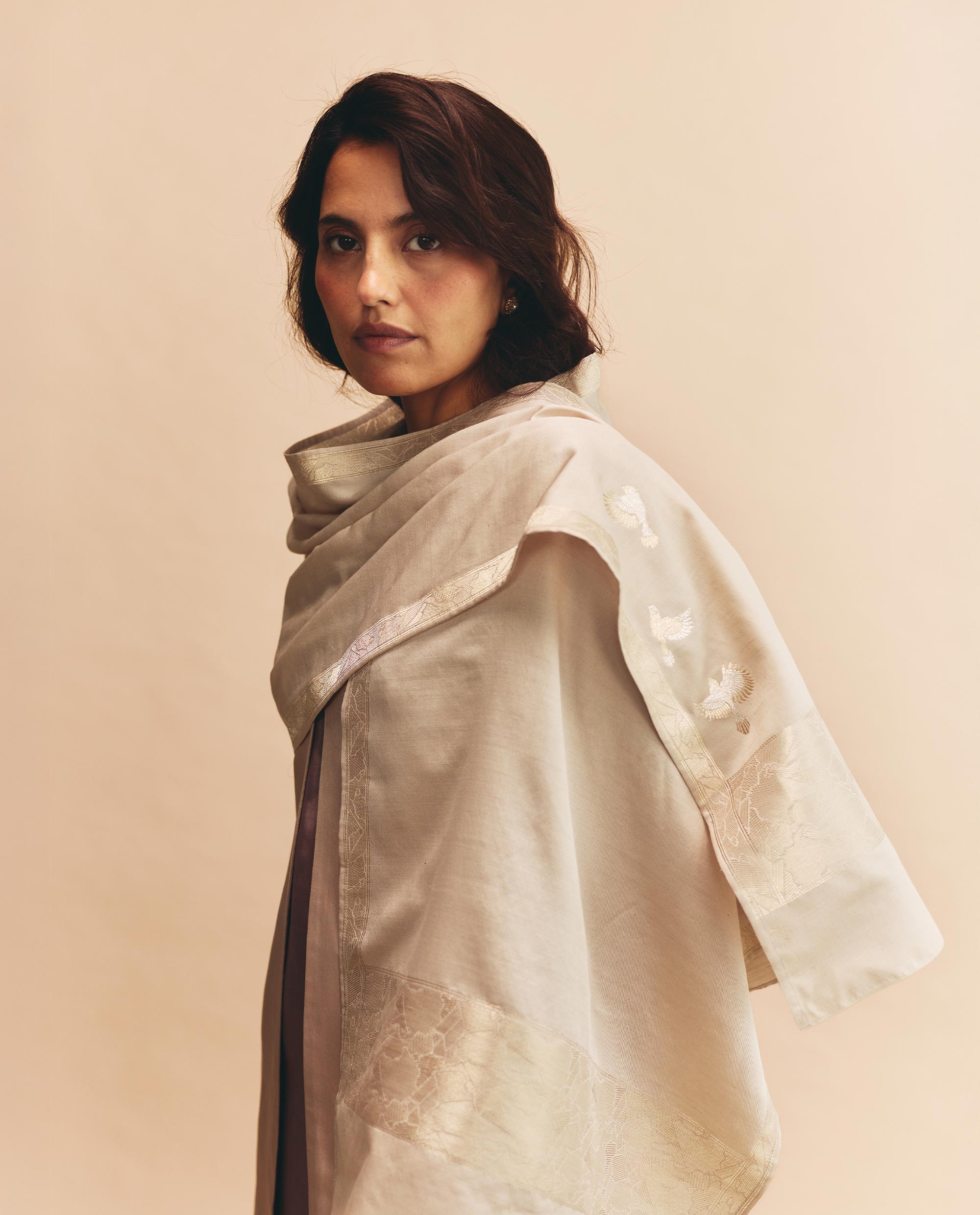 From this stillness, the collection finds its transformation. Silk & Wool turns inwards toward the thresholds where tradition evolves by deliberate design. Rather than ruptures or chance occurrences, the collection emerges from intentional departures. Moments where the familiar is re-examined, where legacy opens itself to new interpretations. The essence of Banarasi’s past is not replicated but consciously rearticulated, imprinted onto the present through refined patterning, earthy palettes, and enduring Kadhua weaves.