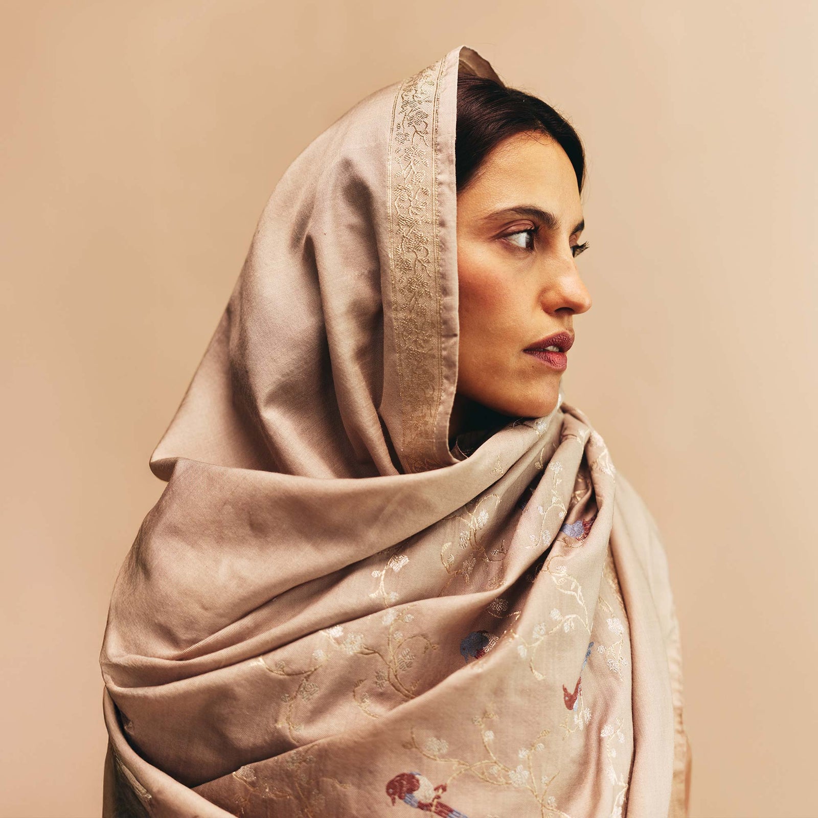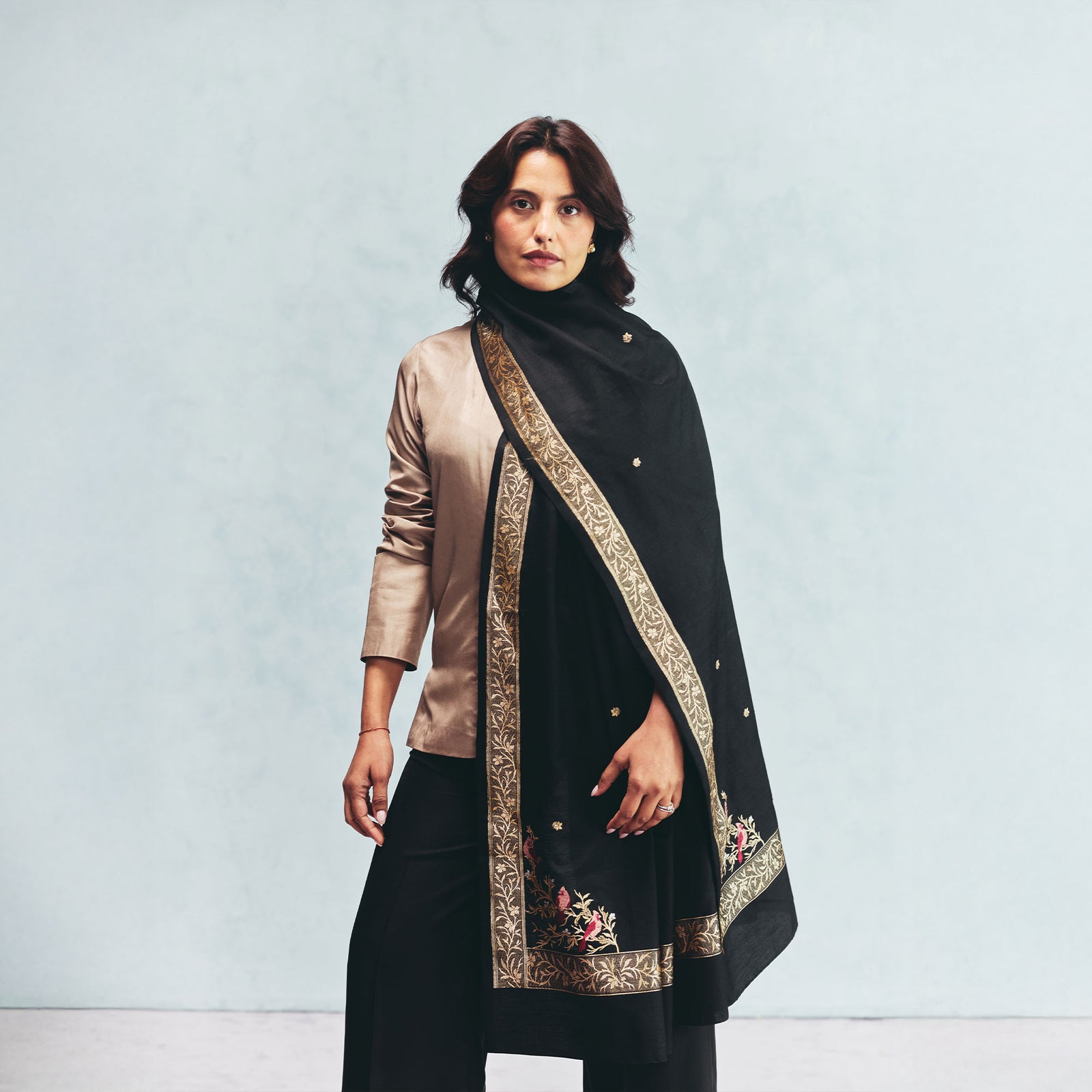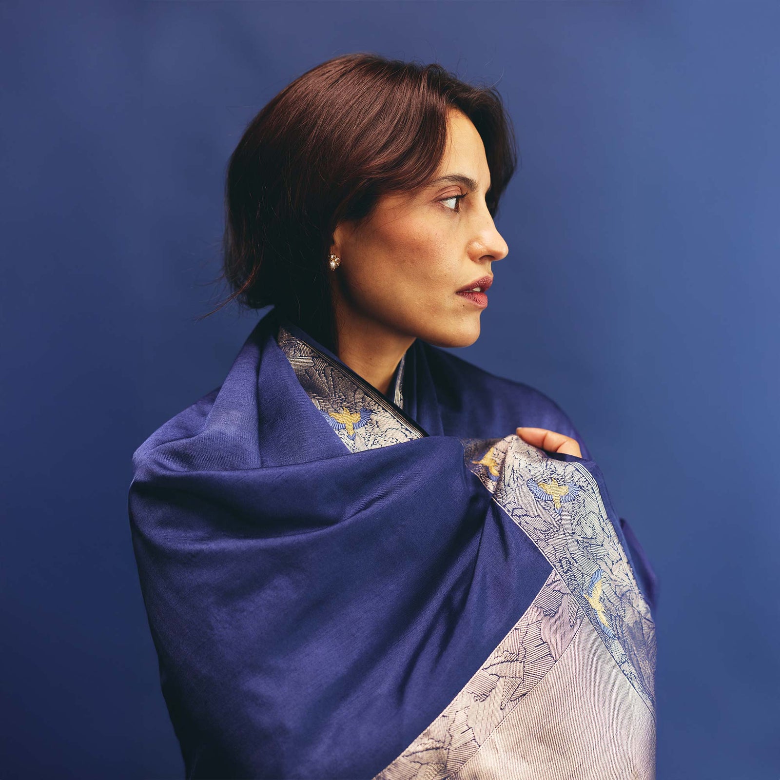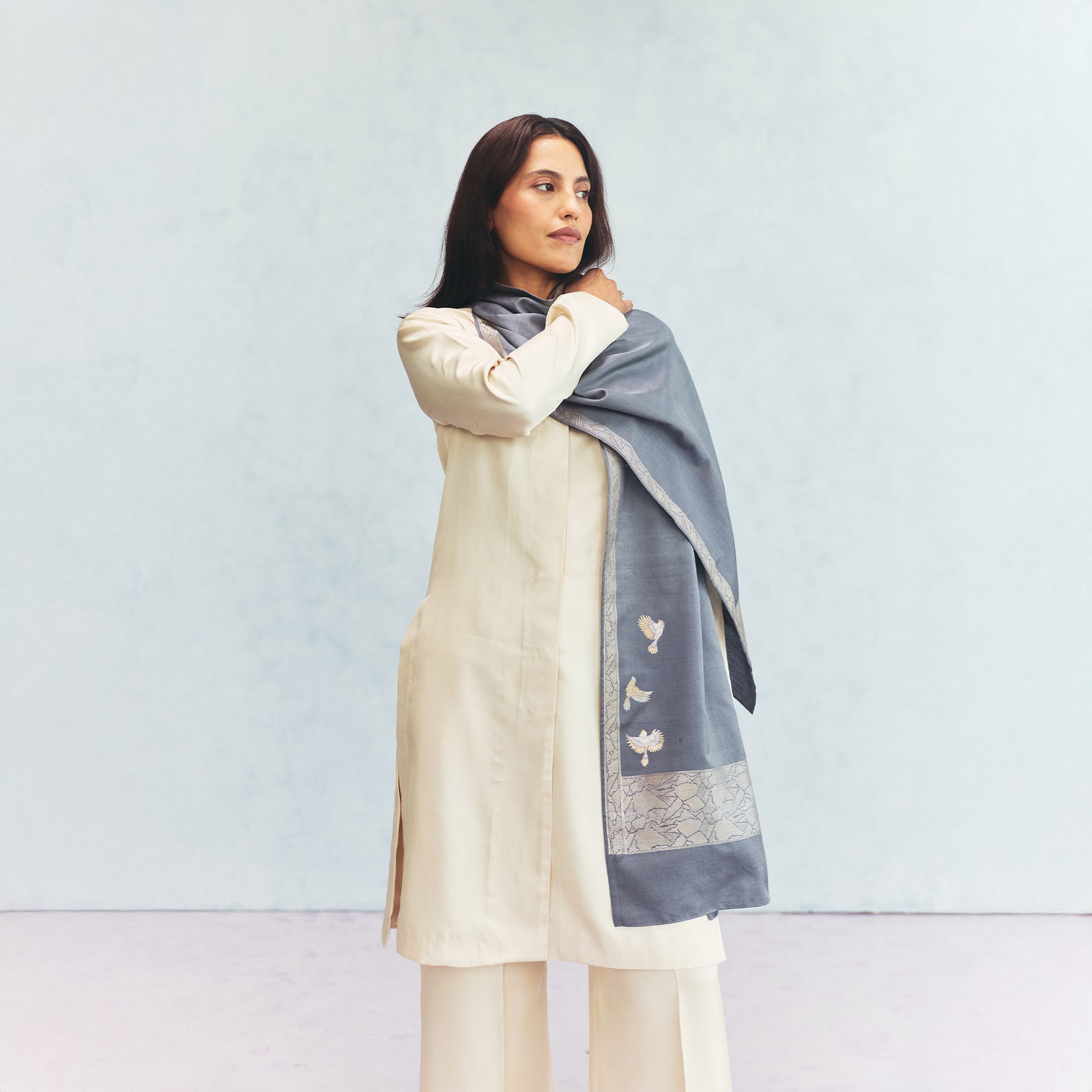 Tilfi’s Silk & Wool collection extends Banarasi into new material terrain, uniting the warmth of Pashmina with the lustre of silk. Handwoven with pure silk in the warp and Pashmina wool in the weft, the textile finds balance between softness and structure: an elegant stillness shaped by discipline, innovation and touch.