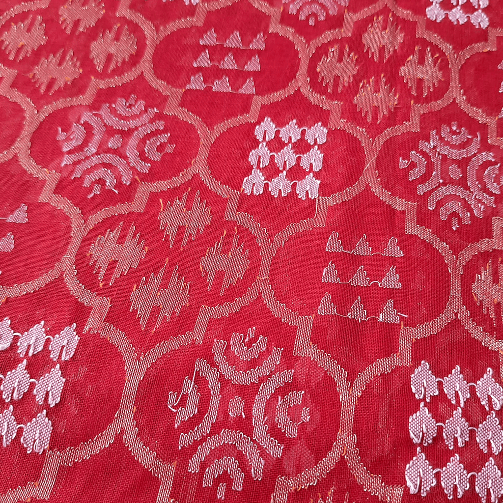 Jamdani is a weaving technique of fine loom-embroidery that traces its roots to the region of Dhaka in Bangladesh. Known for its extremely fine quality and ethereal appeal, Jamdani weaving comprises a discontinuous extra weft yarn that is woven into the threads of the warp. Most often, the patterns are made using heavier threads on a lighter, translucent fabric such as handwoven cotton or muslin. The painstaking process of patterning results in a light and comfortable textile with a reverse that is nearly indistinguishable from the front and has no float.