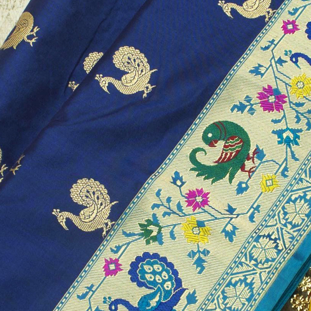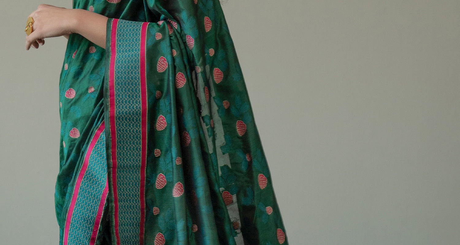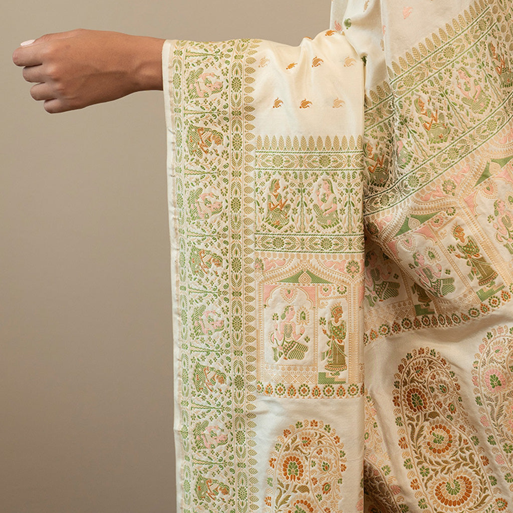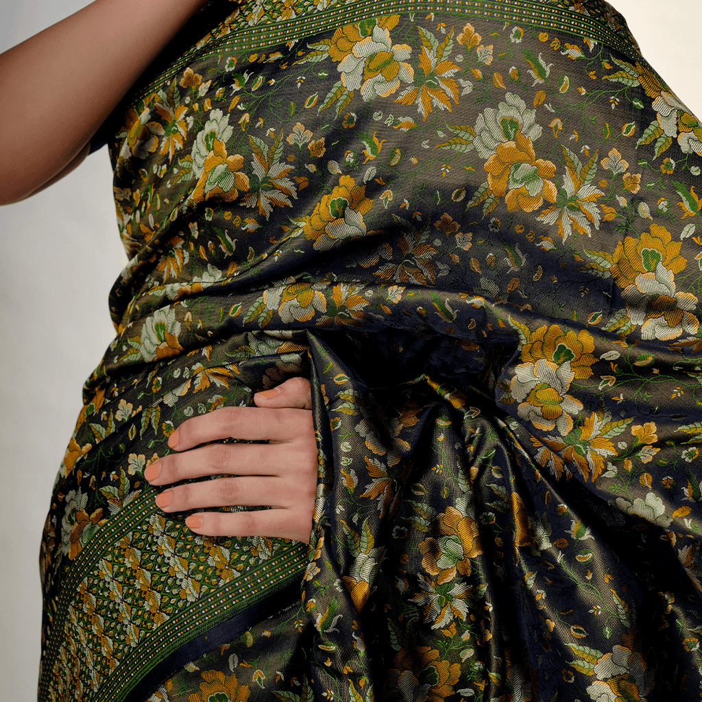 The endearing Baluchari is the traditional weaving of silk sarees that are famed for their pictorial borders and pallu with floral or geometric designs. In the 14th and 15th century, weavers from Varanasi migrated and settled in Baluchar, a village in Bengal. They handcrafted silk sarees in brocade-style with extra weft yarn in silk and not zari. Baluchari sarees, including Banarasi Balucharis, are known for their artistic motifs depicting scenes from the epics or sculptures made on historical temples, woven on its borders and pallu.