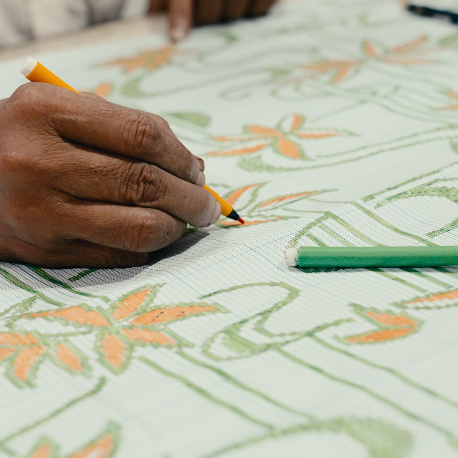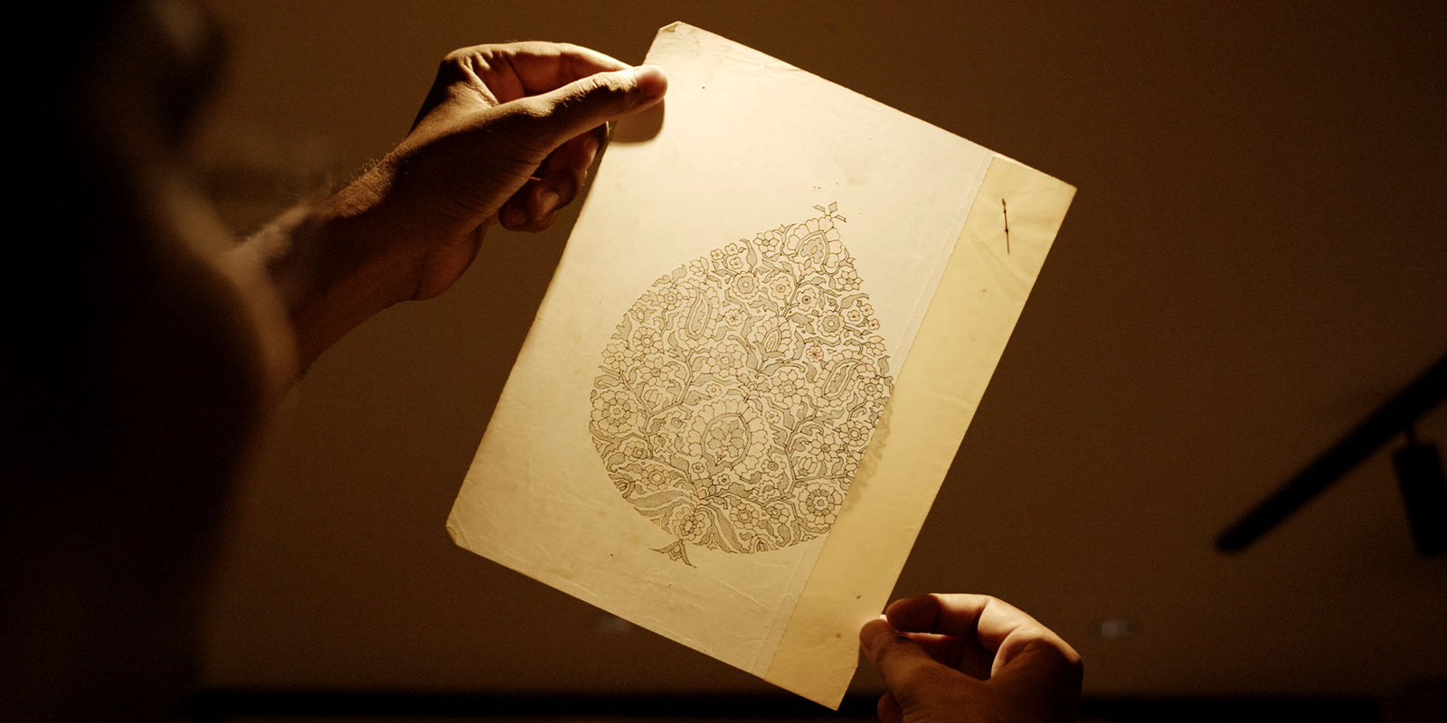 Once the design to be woven is finalised (hand drawn or digitally produced), it is translated onto a large graph paper, inch-wise. The process is called "Likhai" and done by the grapher, locally known as "Nakshaband". The Naksha, carefully designed and precise, acts as a blueprint to be hand punched on cardboard stencils called "Naksha Pattas". The higher the number of grids which translate to an inch of the fabric, the greater is the resulting intricacy and level of weaving complexity!