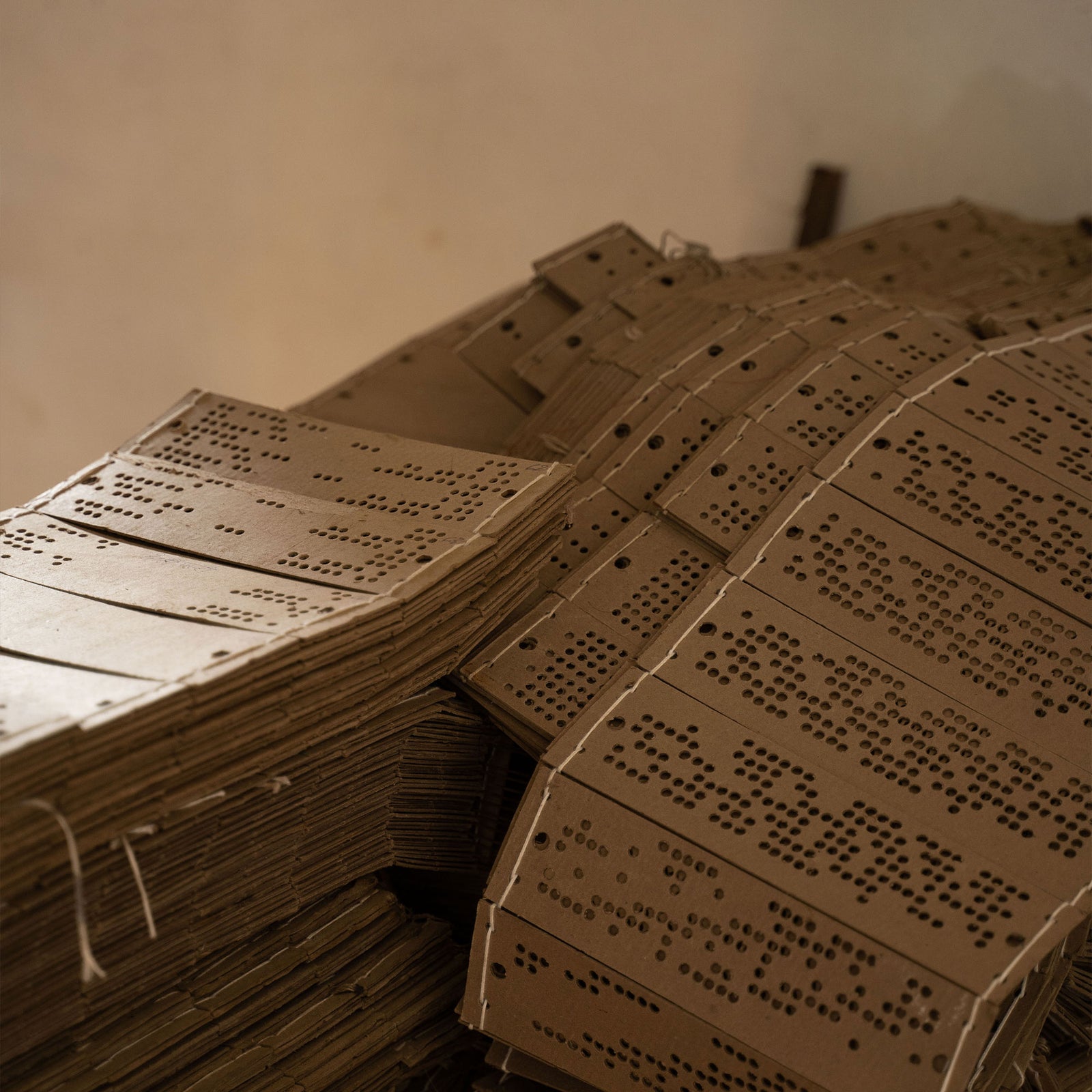 Naksha Pattas are linked in a chain-like structure and attached to the jacquard loom. The cards collectively form the mechanism required to lift the necessary yarns during the process to weave a motif and help translate the pattern in the fabric. A couple of hundreds to even a couple of thousands of graphing cards can be required in weaving, depending on the design of the Banarasi saree. A bigger size and large number of Naksha Pattas define a more complex pattern.