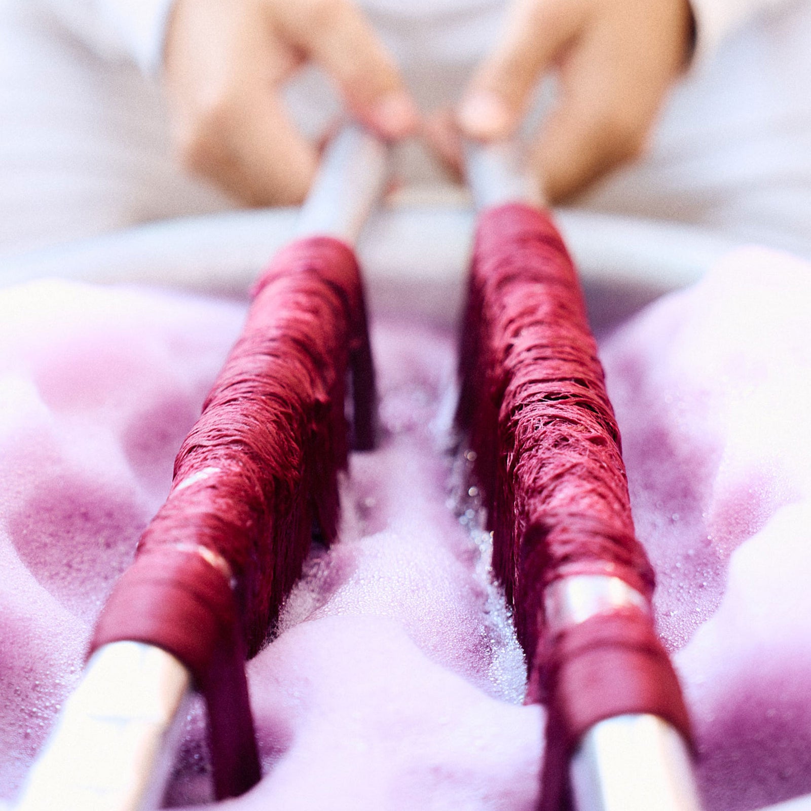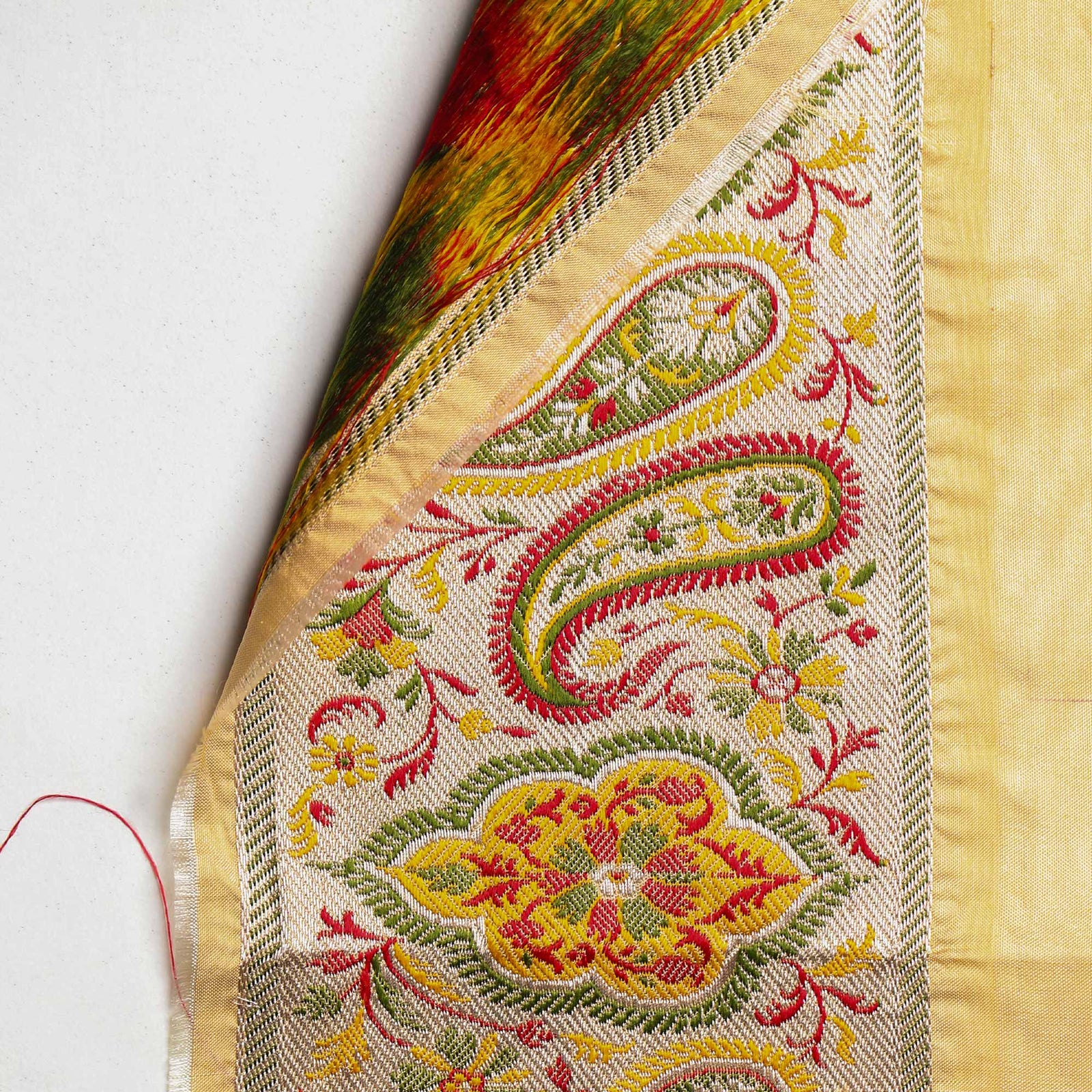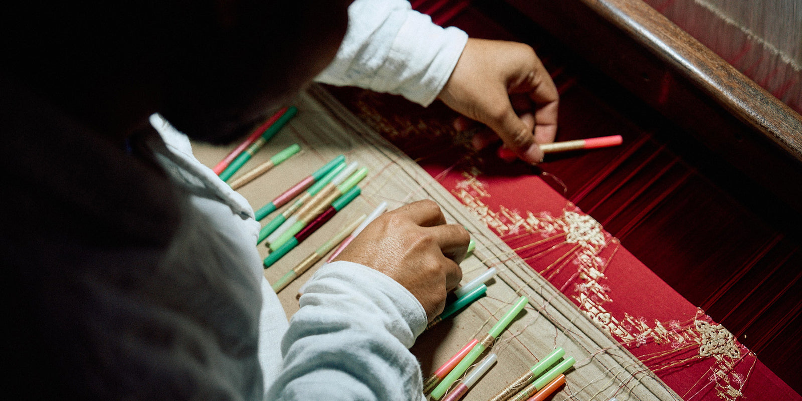 Once a pattern has been designed, graphed with a certain number of colours in mind, and set up on the loom, individual colours are carefully chosen for each element. A swatch is then woven to assess the selections. After several iterations and engaging discussions between the design team and the weavers, a beautiful saree emerges. ⠀