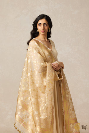 A Banarasi delight! A breathtaking meenakari jangla of extraordinary delicacy, handcrafted in a delicate hue on a diaphanous base of pure kora silk. An entirely unforgettable and irreplaceable piece of handloom art.