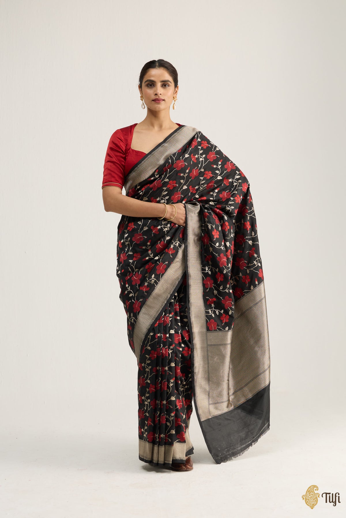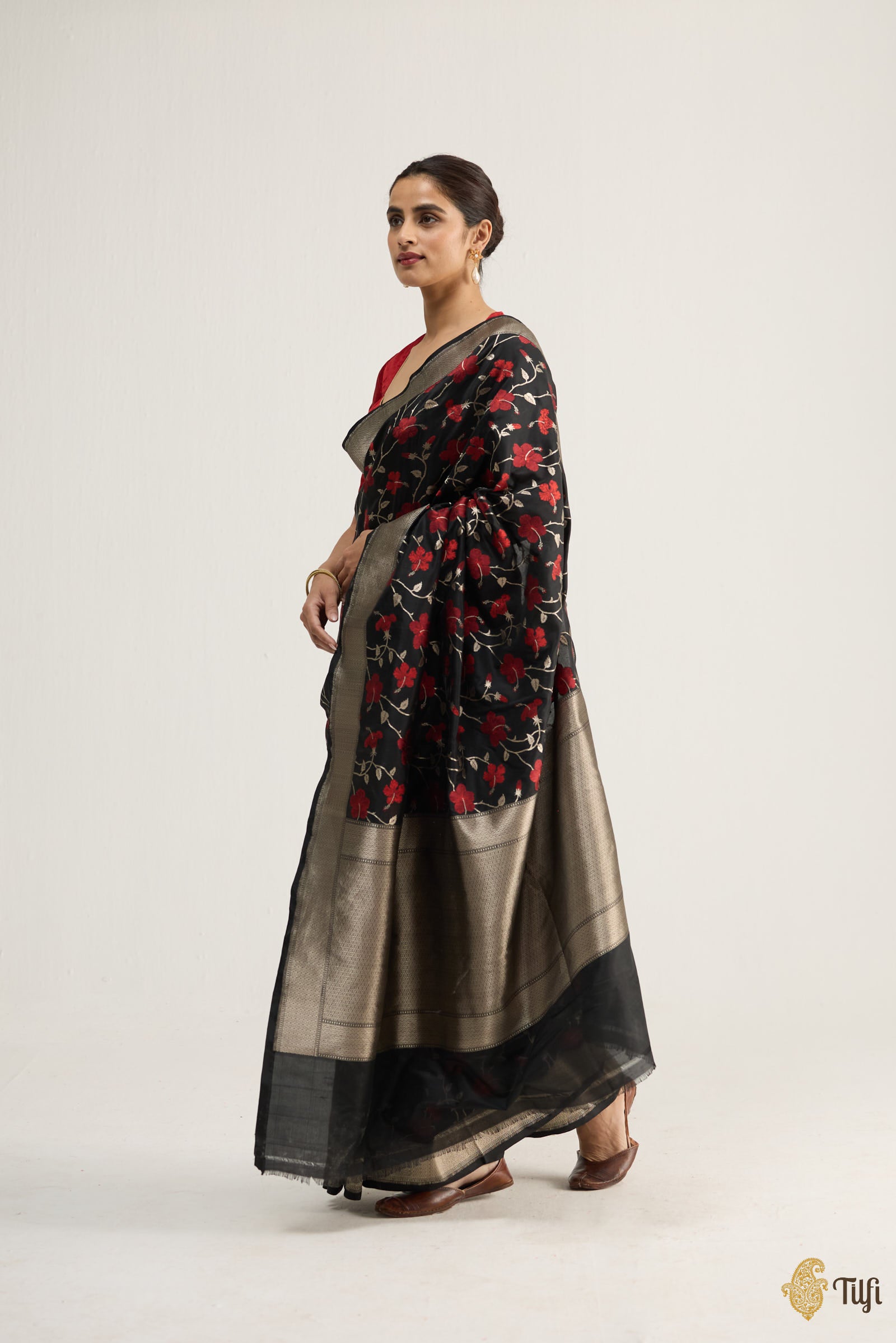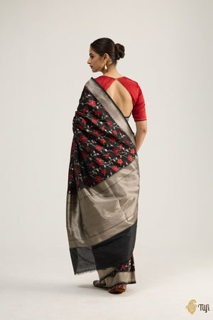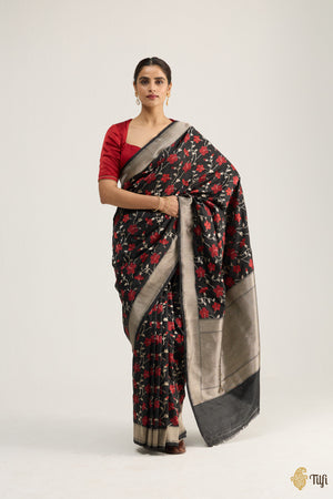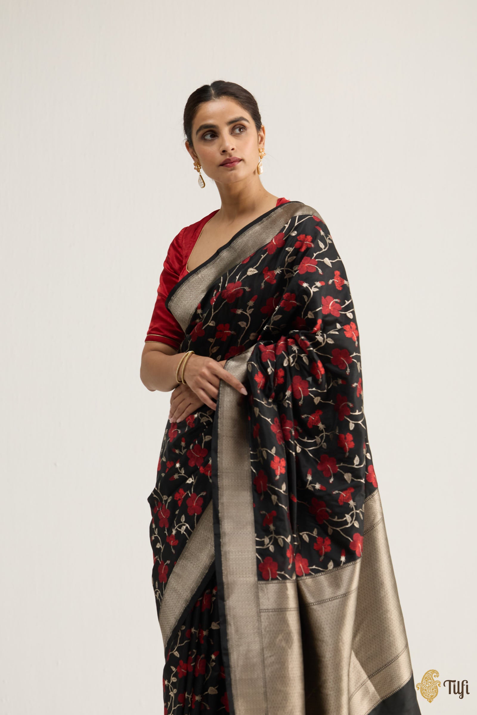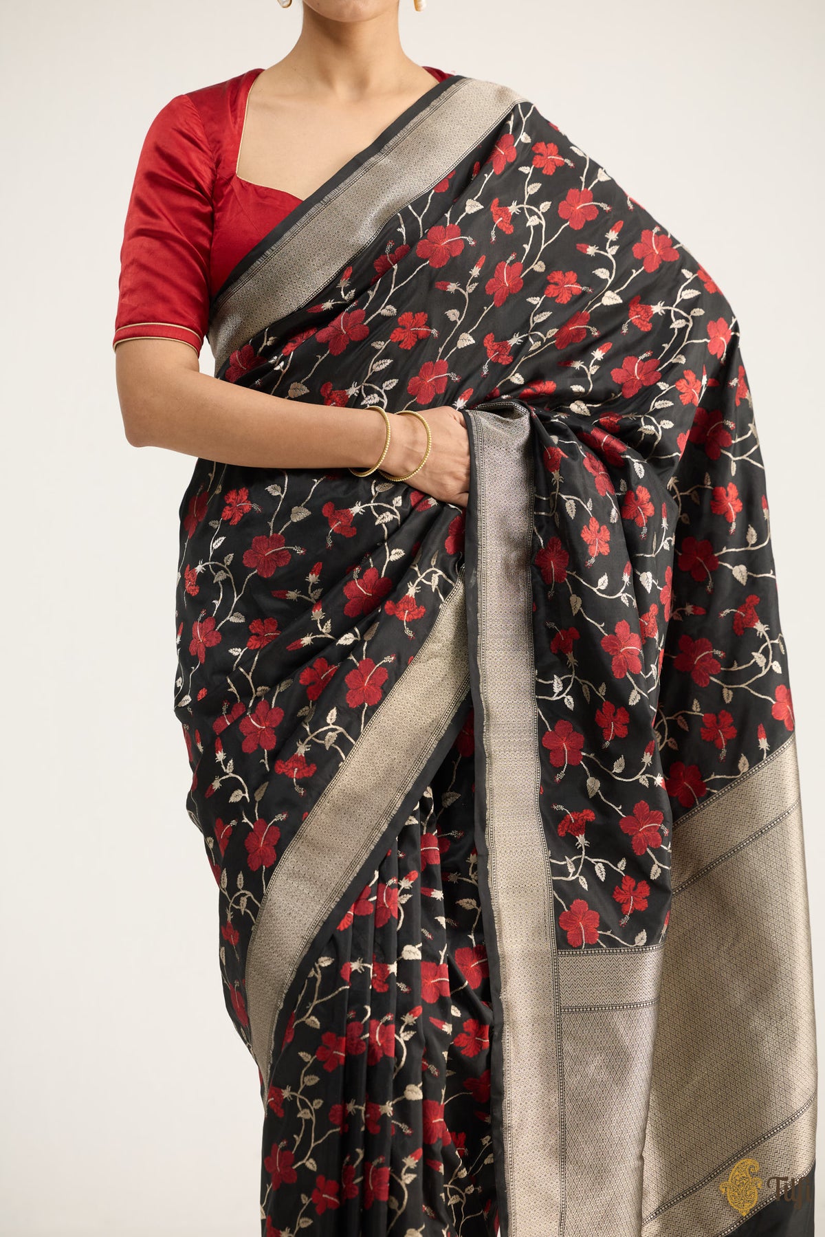 'Hibiscus' Black Pure Katan Silk Banarasi Handloom Saree