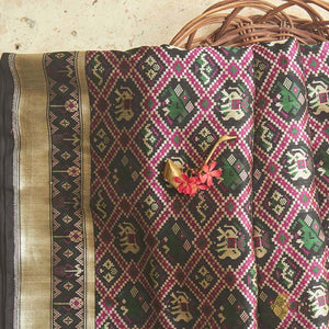 Technique - A Gujarati Patola design created using a classic handwoven Banarasi Meenakari art passed down through generations. Meenakari involves the painstaking addition of supplementary coloured resham threads during the hand-weaving process.