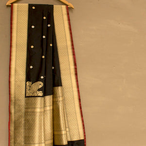 Speciality - An elegant Bootidaar pattern with a koniya aanchal or paisleys at its corners. The corners are particularly difficult to weave as they are a break from the running pattern, but koniyas look magnificent when worn.