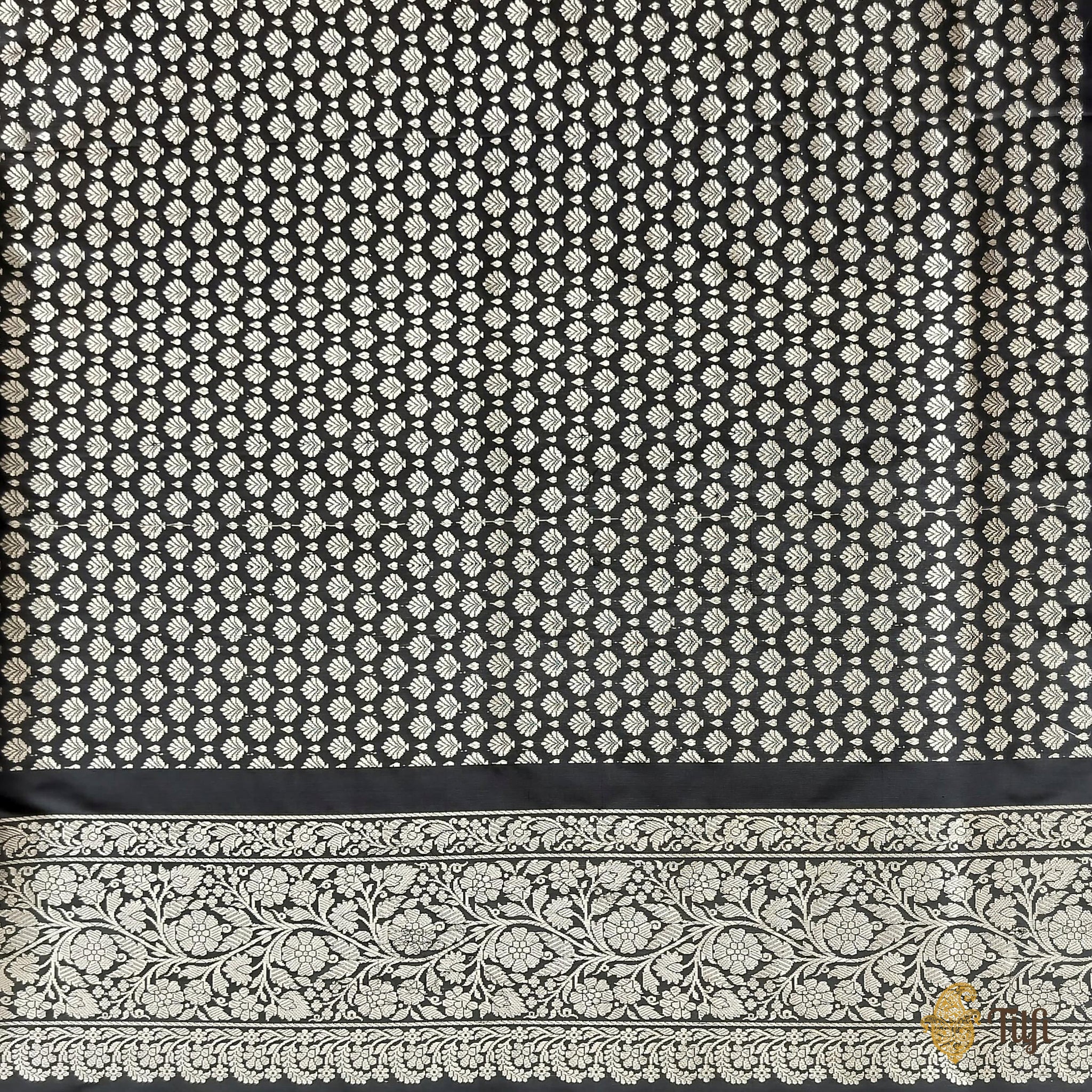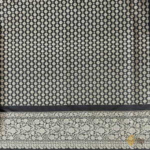 Enchanting like a new moon night, this is a ravishing katan silk saree. With an intricate silver zari border and a magnificent koniya aanchal, on a bed of black like the night sky, this saree will take your breath away!