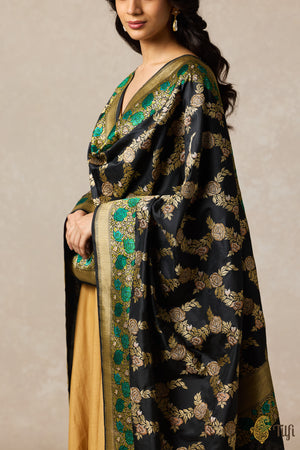 A delicate kadwa jaal of blooming roses, woven in roopa sona and antique zari, graces this dupatta. The floral expanse is framed by a striking meenakari border, adding a nuanced touch of colour and craftsmanship.