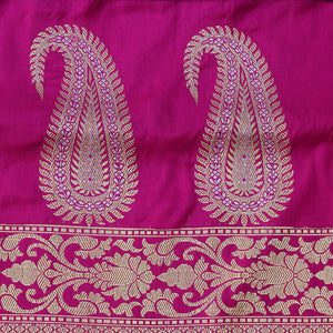 A magnificent kadiyal classic with gold silver zari bootas and contrasting colours! You will love the distinction between the striking black body and the rich pink Kadiyal border with its beautiful roopa sona paisleys and floral bels in two-tone zari.