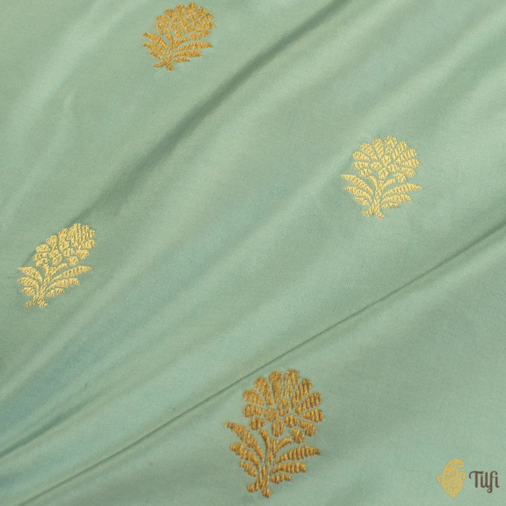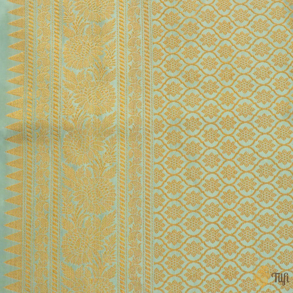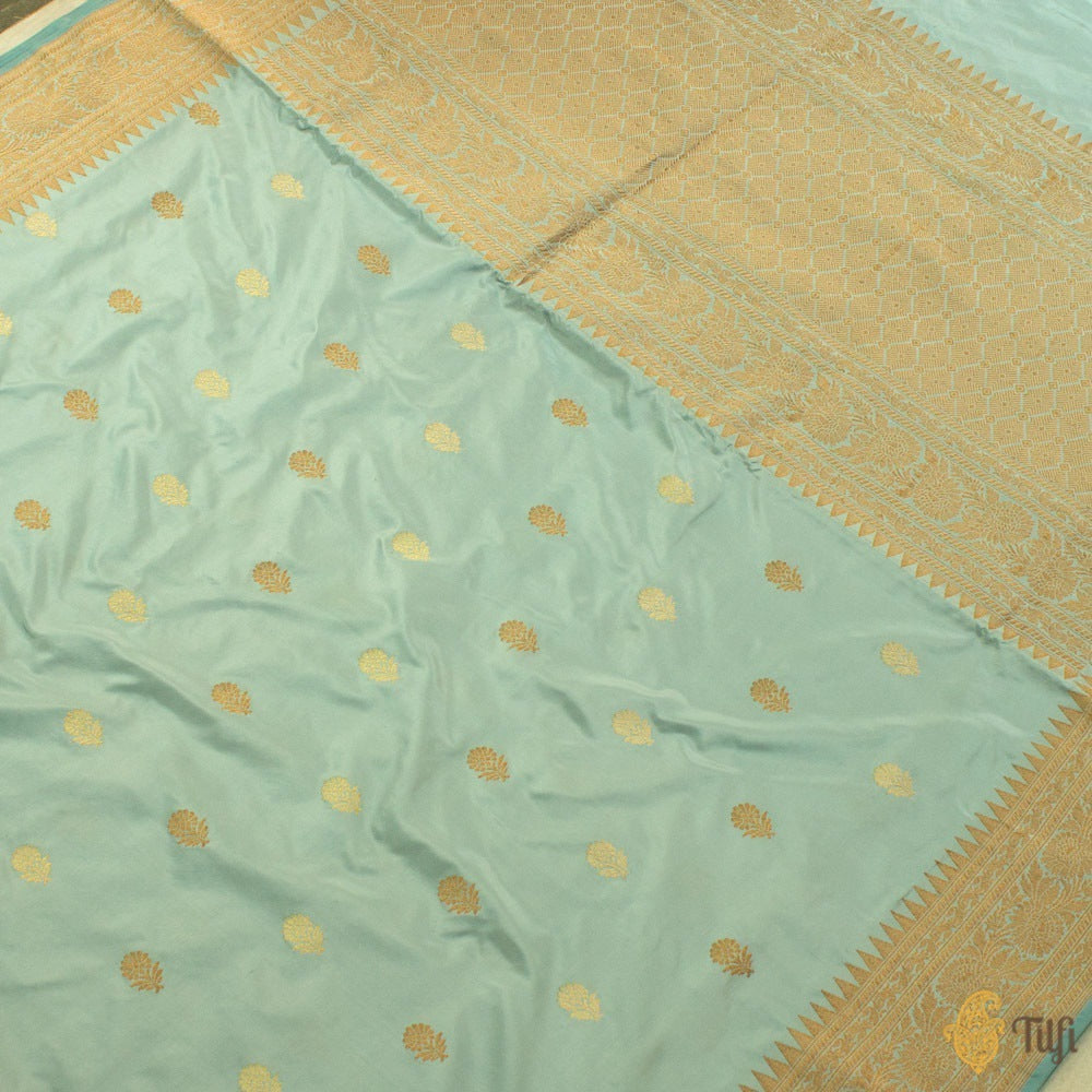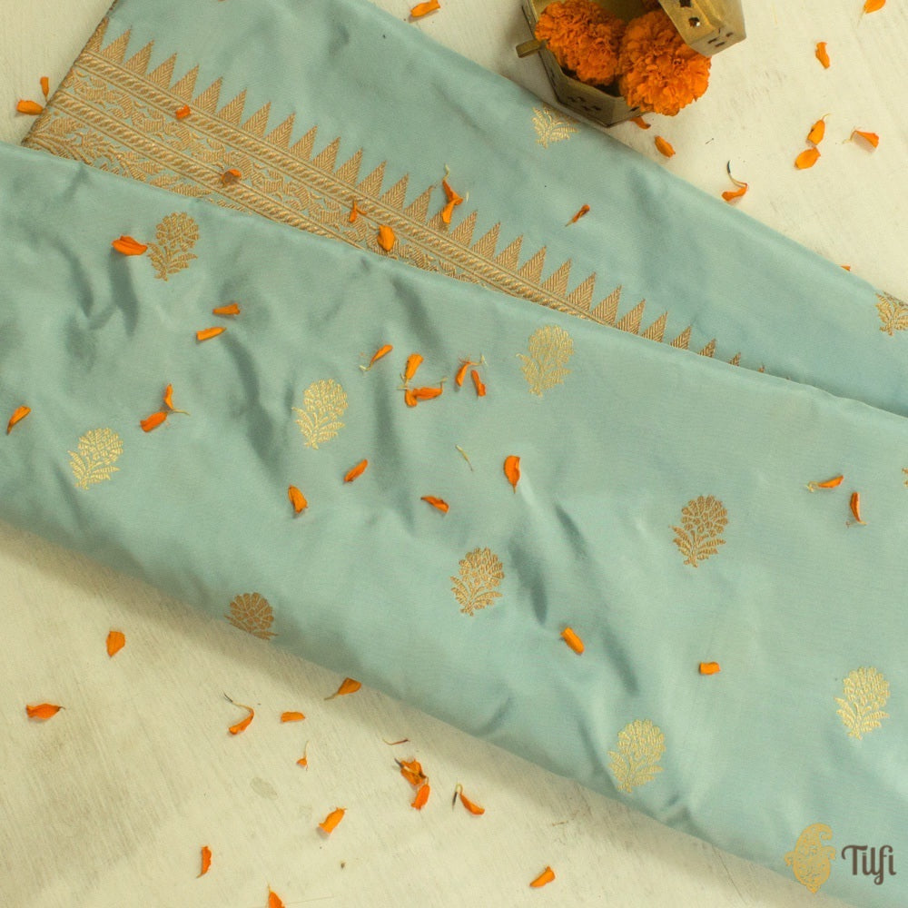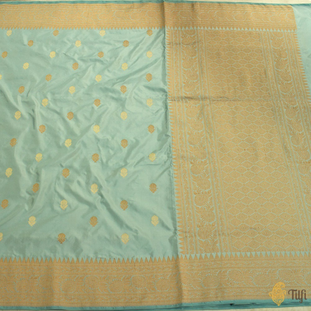 The definition of timeless beauty! Such is the brilliance of this delicately handwoven katan silk, beautifully ornamented with intricate bootis in roopa and antique zari.