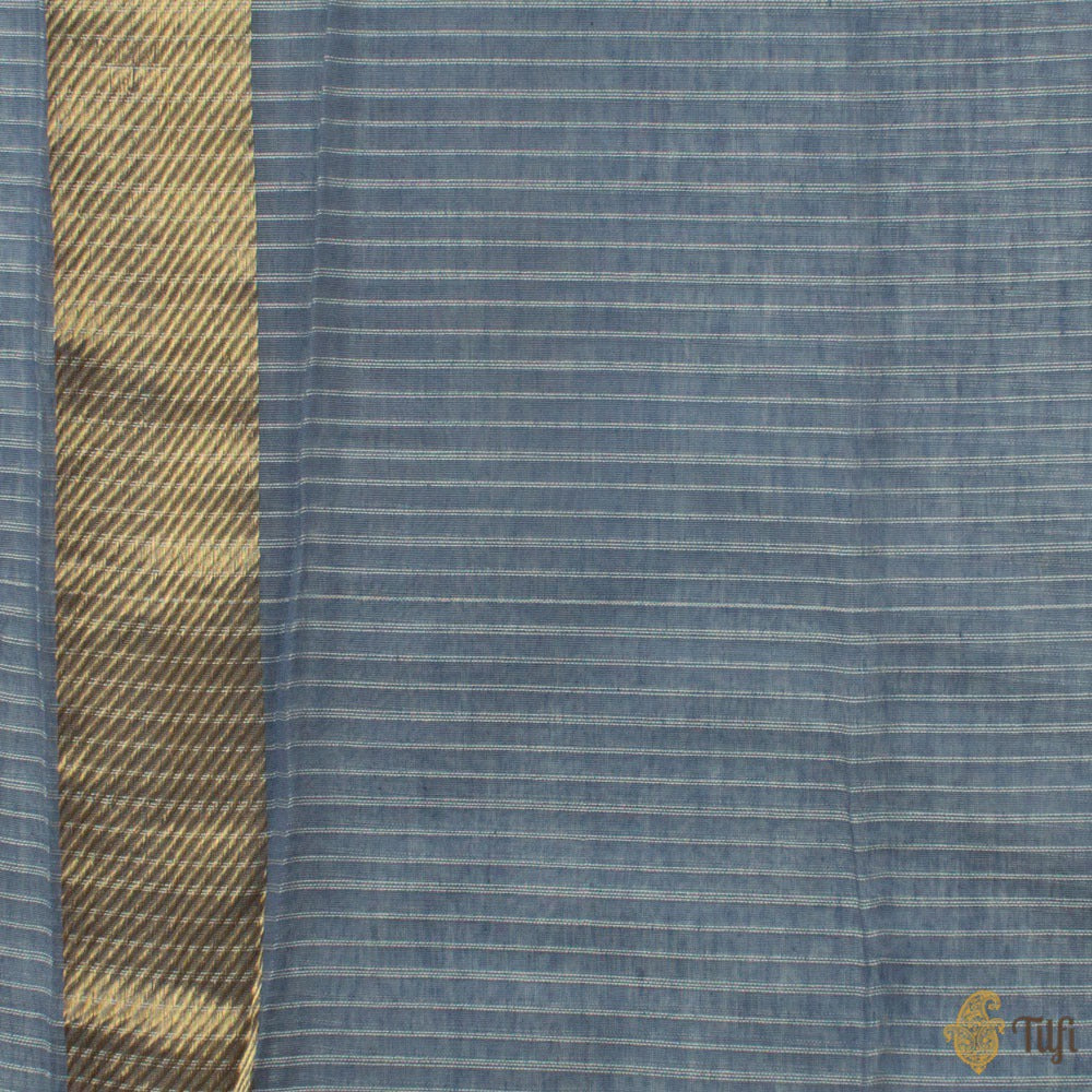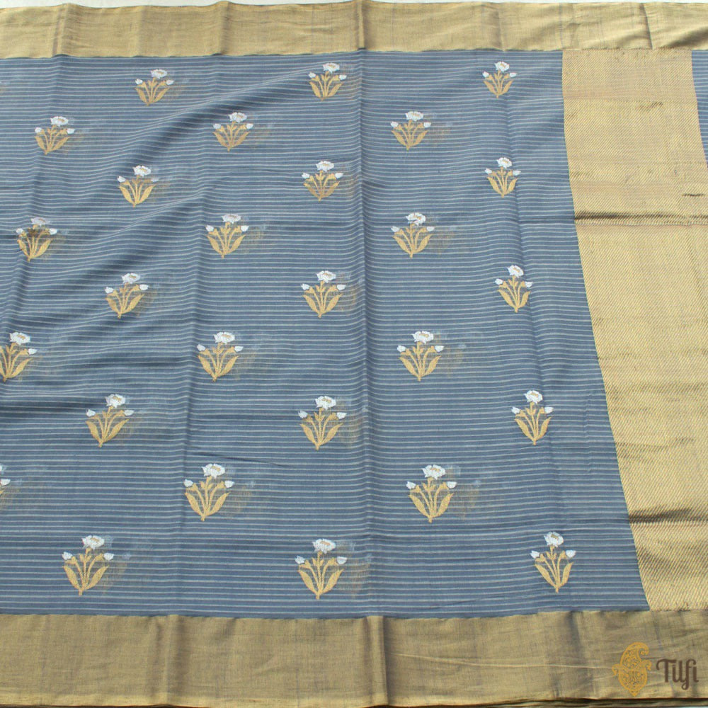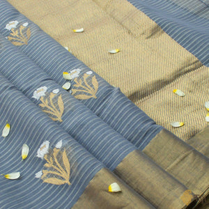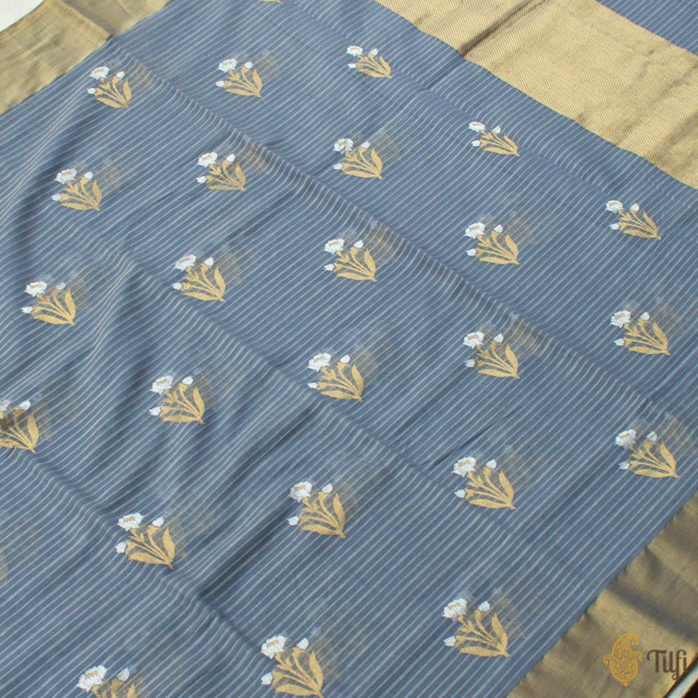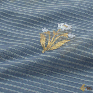 Trés Chic! This is an elegant and fashionable Banarasi masterpiece with delightful stripes and regal floral motifs woven in gold and silver zari. Irreplaceable!