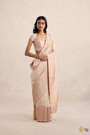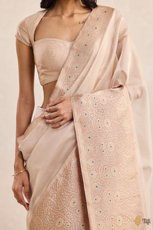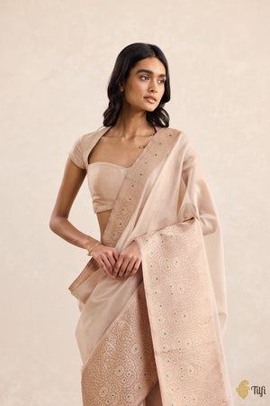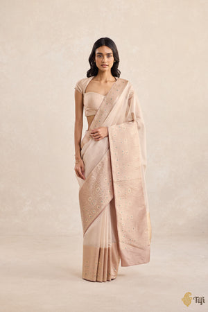 A serene expanse of kora silk by georgette, Borders of Time finds its anchor in an exquisitely detailed border in silk. Slightly angular paisleys unfold in intricate succession, punctuated by delicate strokes of meenakari — subtle hints of colour that shimmer like echoes from another age. A drape that carries the weight of tradition with the quiet grace of memory.