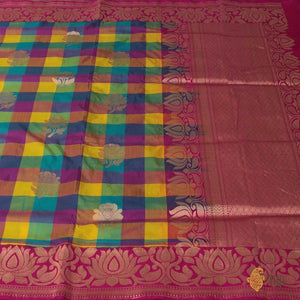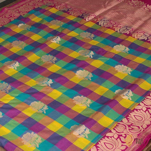 Go forth and be a pop of color in a black and white world! Our trendy and vibrant Banarasi check saree has something for everyone. Spirited colours and fine handwoven art for any celebration.