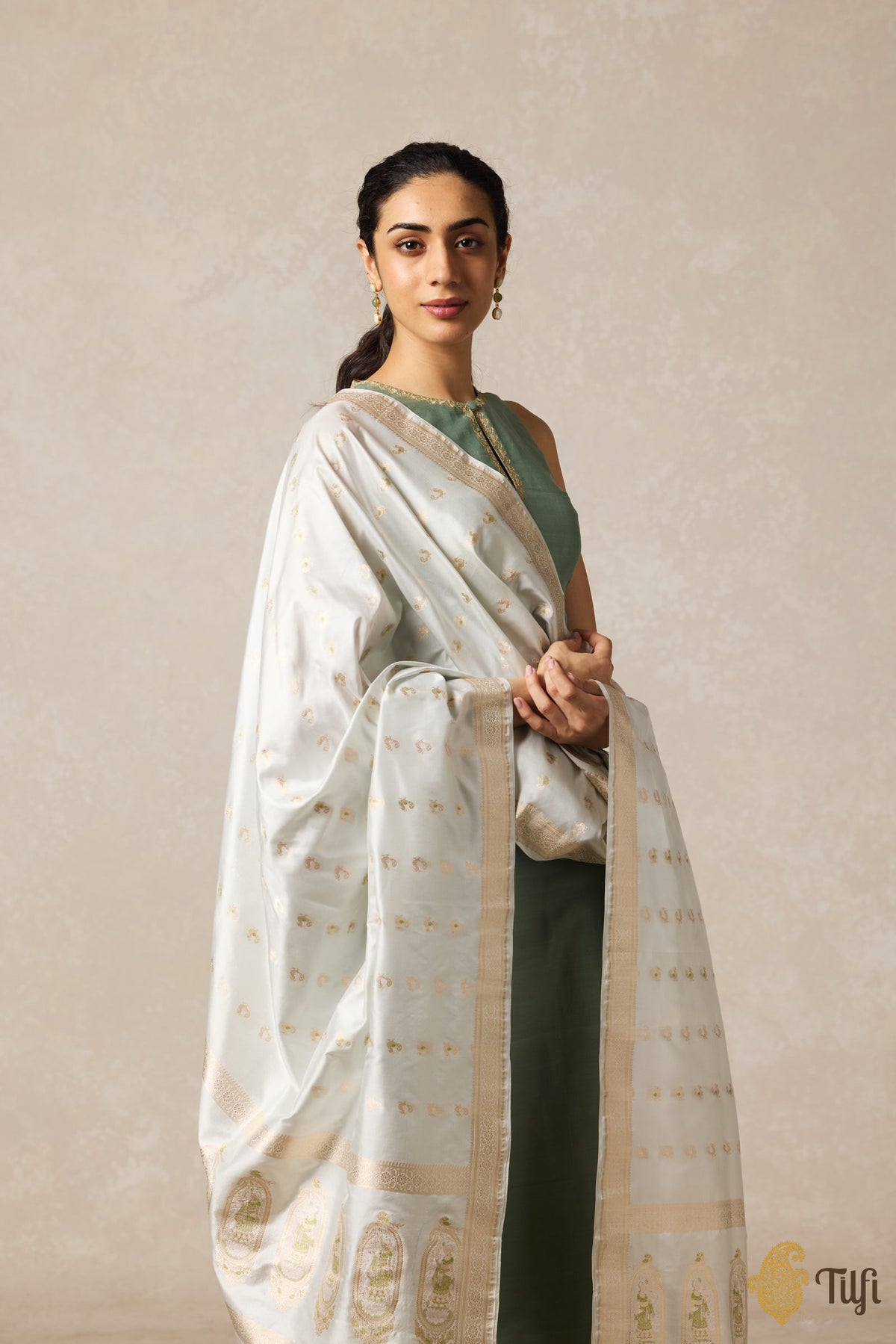 Reminiscent of a bygone era, this handwoven dupatta is fit for queens. True to form, vintage Banarasi with regal peacock motifs in zari and meenakari and a Baluchari inspired aanchal. Beautiful and timeless.