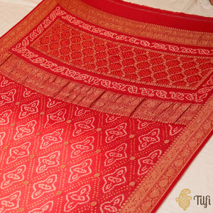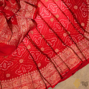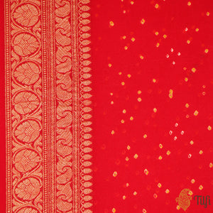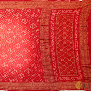 A celebration of Indian textile arts! This handwoven Banarasi saree has been hand-dyed in the classic Kutchi Bandhani technique. A delicate kadhua bootidaar body with a vibrant Bandhani pattern in gorgeous colours to bring on the festive spirit!