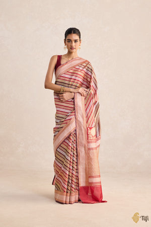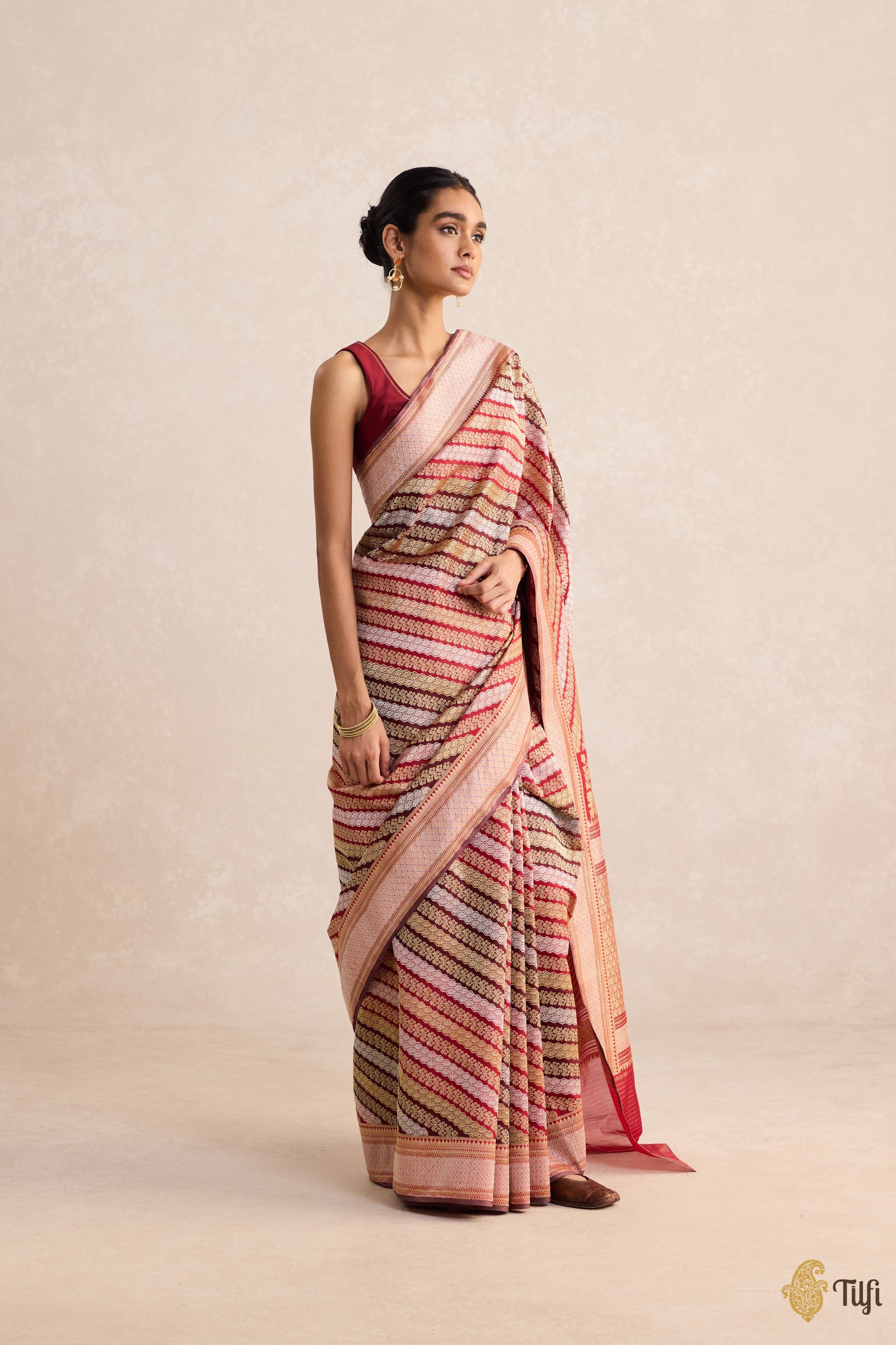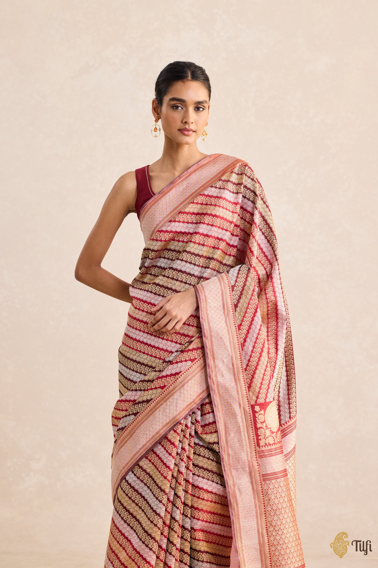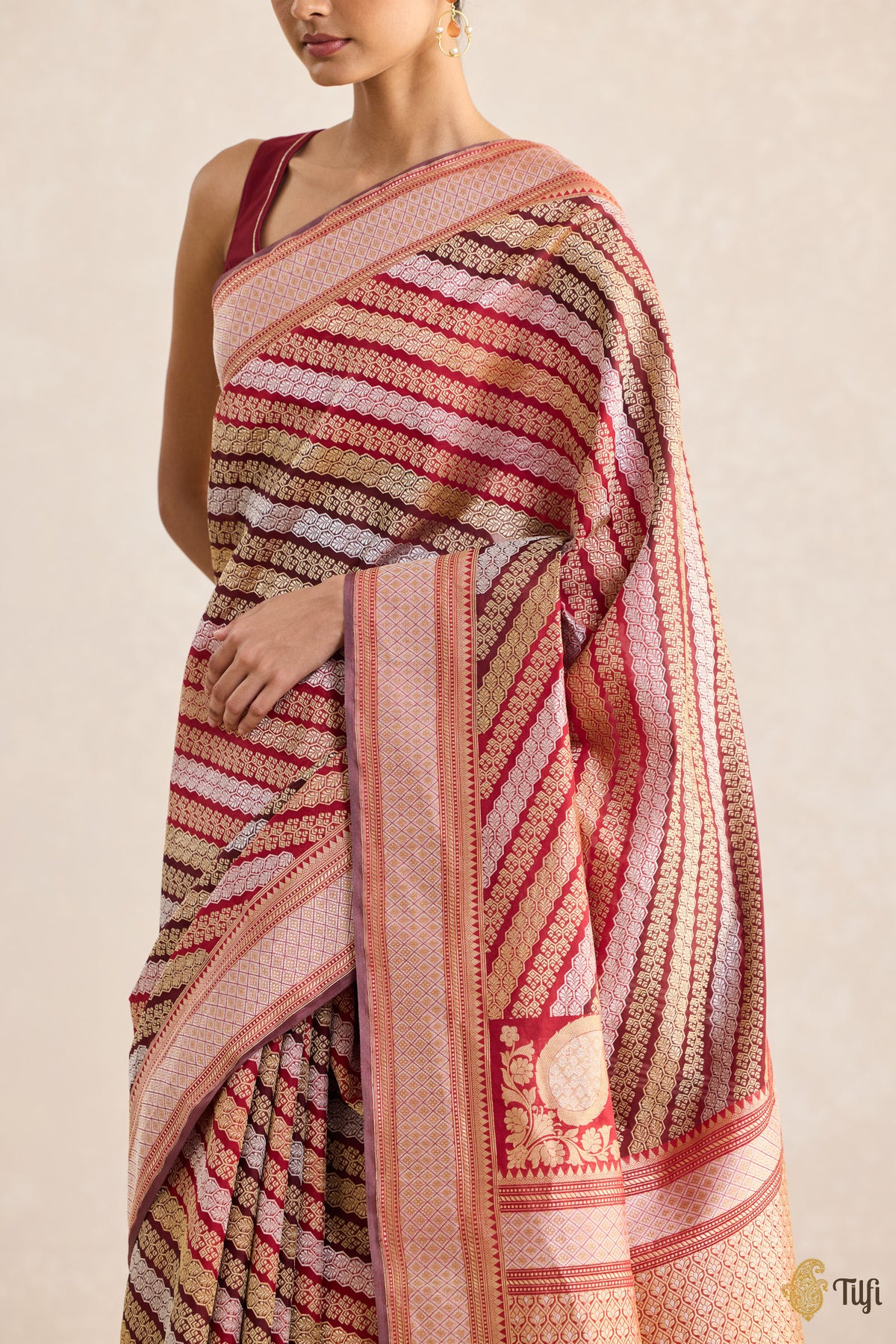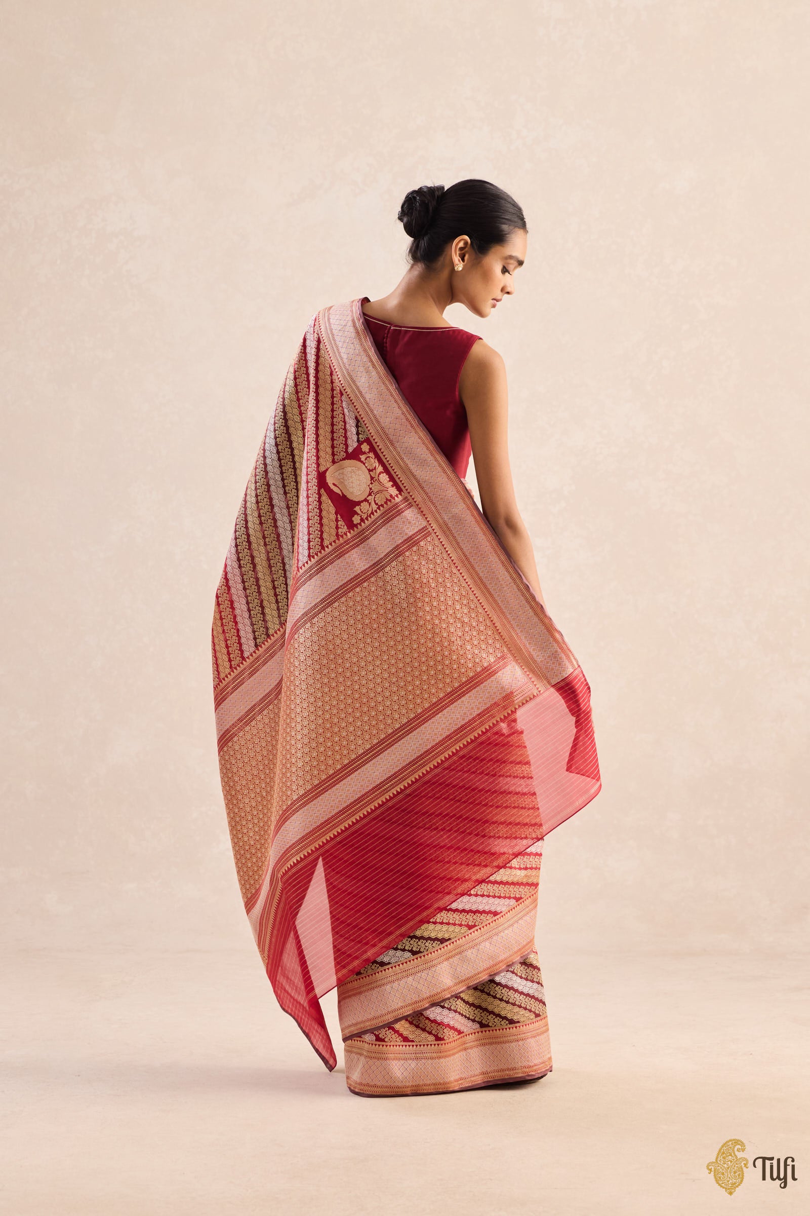 In deep reds and maroons, Crimson Passage unfurls along a heritage diagonal or aadha jaal — a rangkat of shifting tones shaped by centuries of artistry. Gold and silver zari threads carve luminous paths through the colour-blocked landscape, culminating in a stately koniya paisley at the corner of the aanchal. A journey in silk, a crossing of traditions, a passage through time.