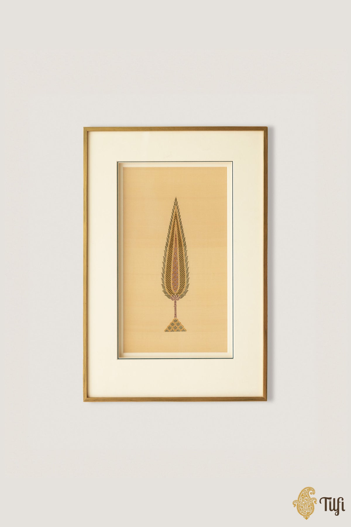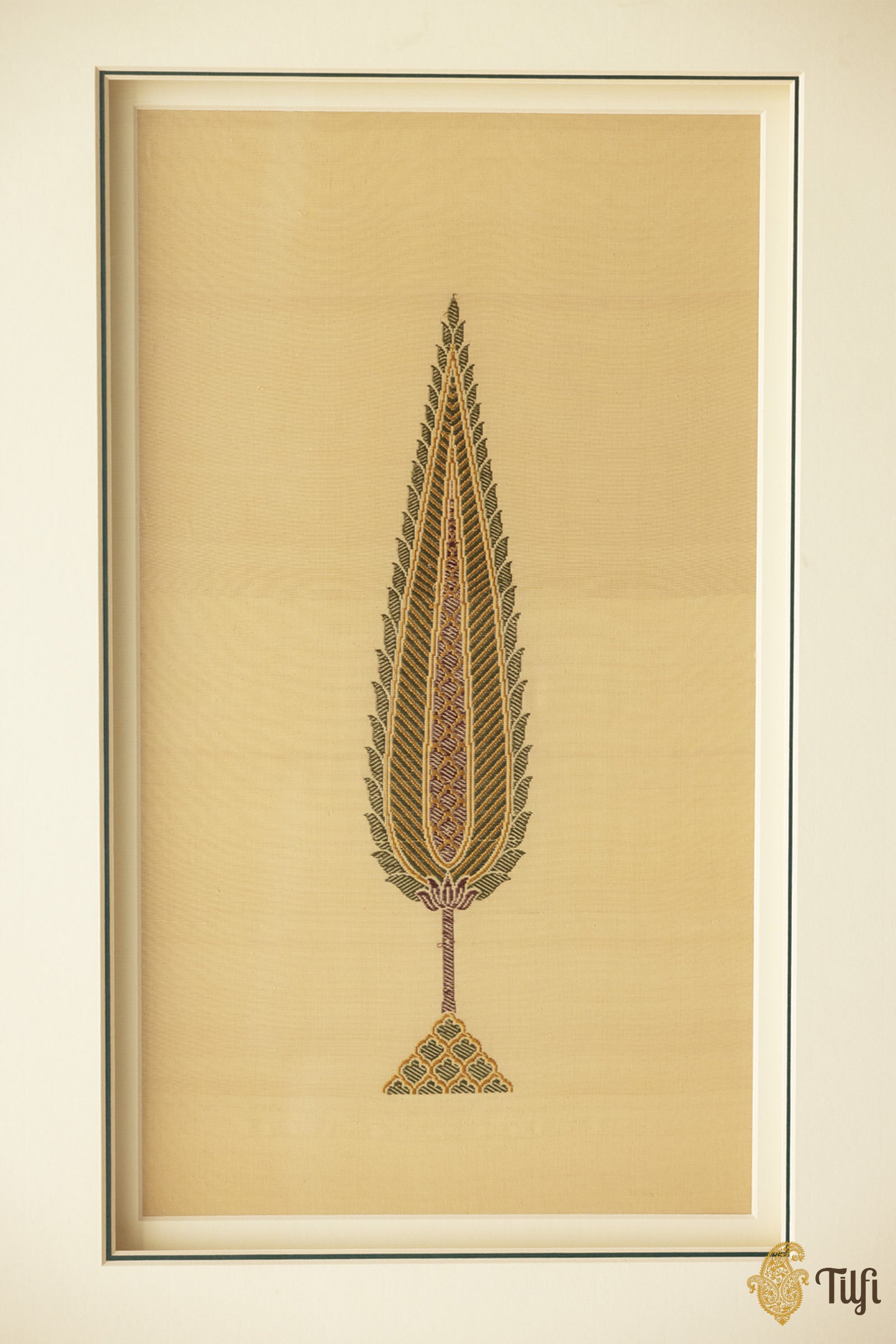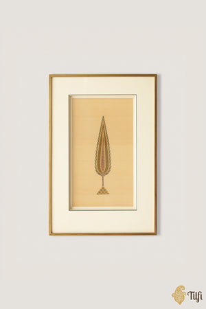 This textile art piece captures the quiet profundity of a motif that traverses civilizations. Inspired by Persian art, the cypress stands as a philosophical symbol—its slender, reaching form an emblem of eternal life. Handwoven in pure Banarasi tradition, the piece transforms this storied motif into a work of intricate beauty.
