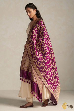 Generations of weaving traditions produce these silken yards of history. This stunning handloom masterpiece is one of our most exquisite Shikaargah dupattas. A beautiful web of zari, figures and animal motifs on a resplendent base.