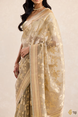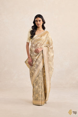 Woven in silver and gold zari and the finest kadhua jangla weave, Garden of Echoes is a tapestry of wandering roses — their vines looping across the body in a timeless floral symphony. A dash of colour along the plain zari border lends a final, whispered flourish. A saree in which every bloom remembers, and every thread sings of time’s gentle passing.