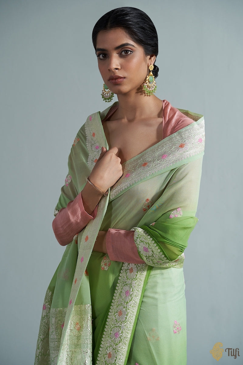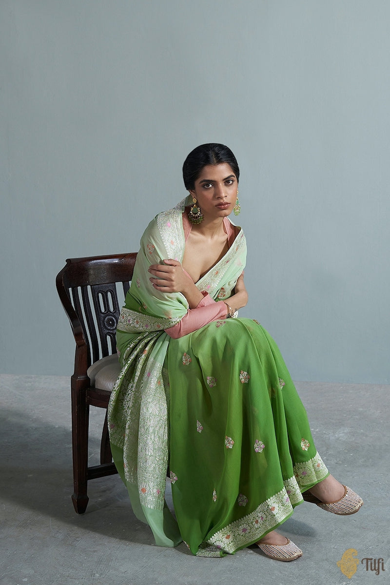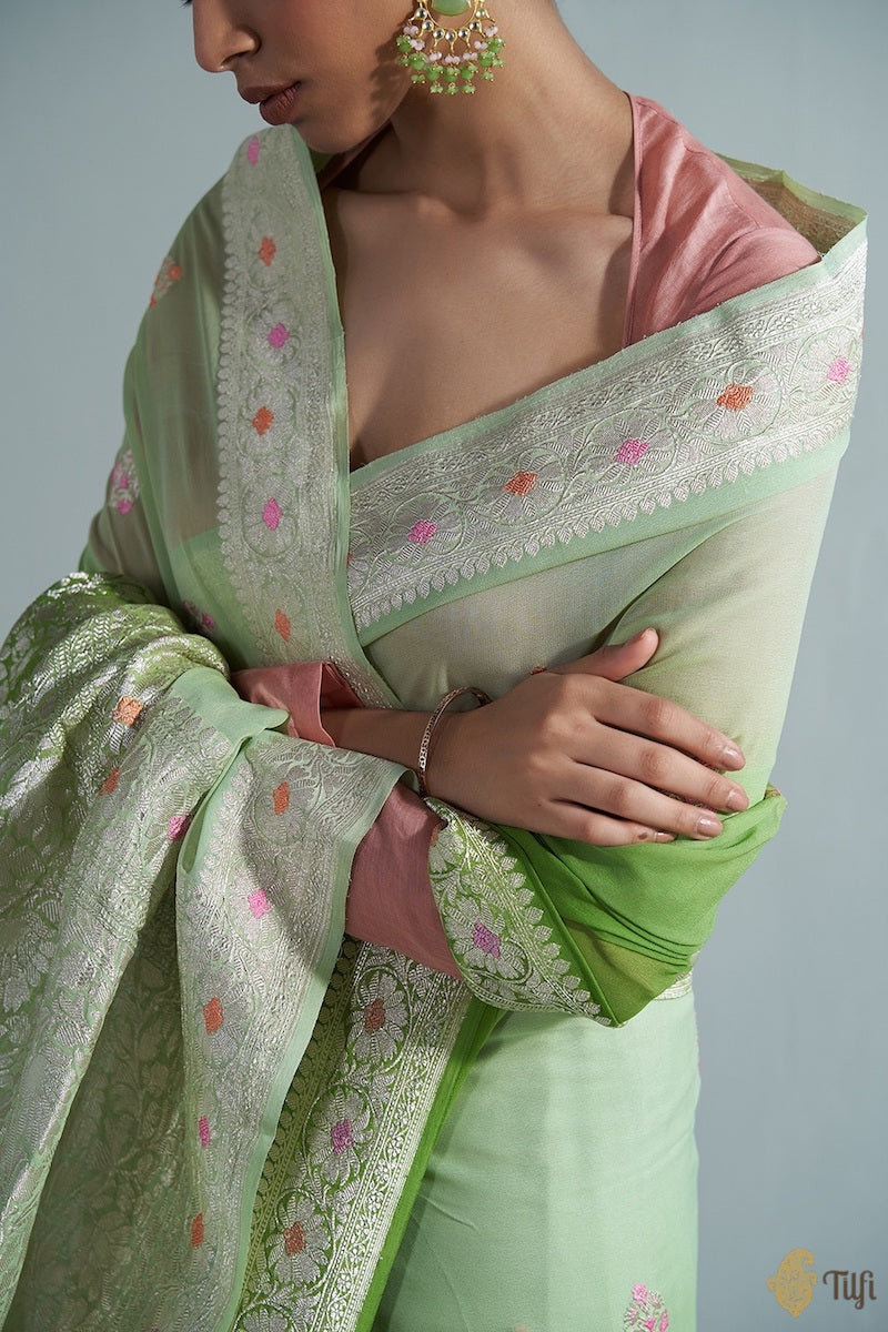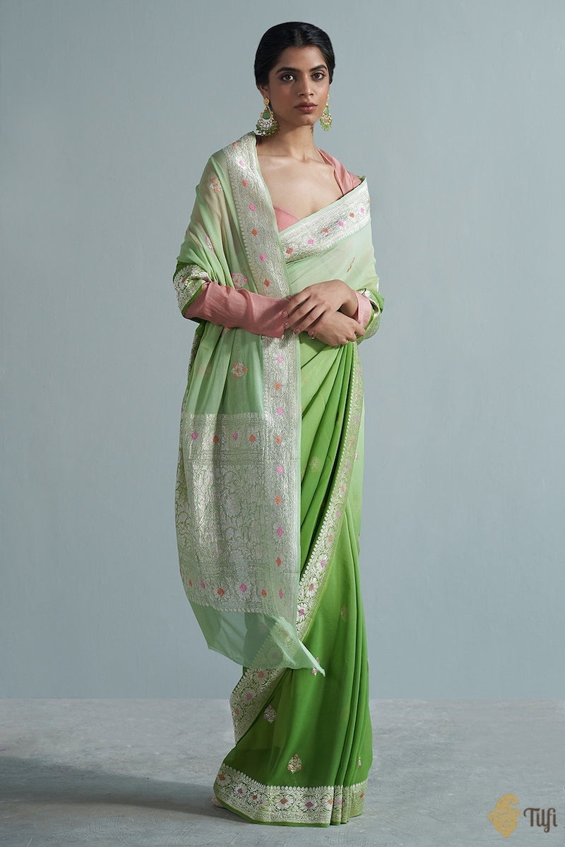 Speciality - Elegant Roopa or Silver zari motifs woven in the exquisite kadwa weave and accents of meenakari on a distinctive bed of handwoven georgette.