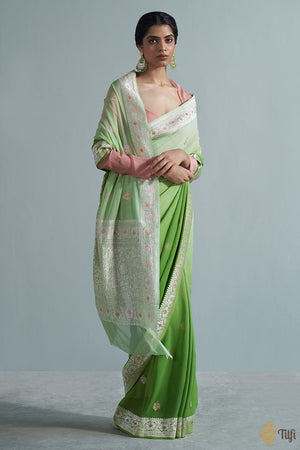 Technique - An enduring Kadwa weave. The elaborate and laborious Kadwa (Kadhua) technique involves hand-weaving each motif separately. It takes longer on the handloom, but makes a more robust pattern, which stands out on the fabric. Classic handwoven Banarasi Meenakari art passed down through generations. Meenakari involves the painstaking addition of supplementary coloured resham threads during the hand-weaving process.