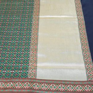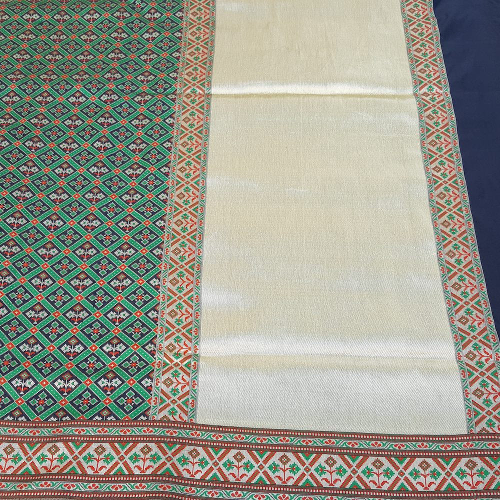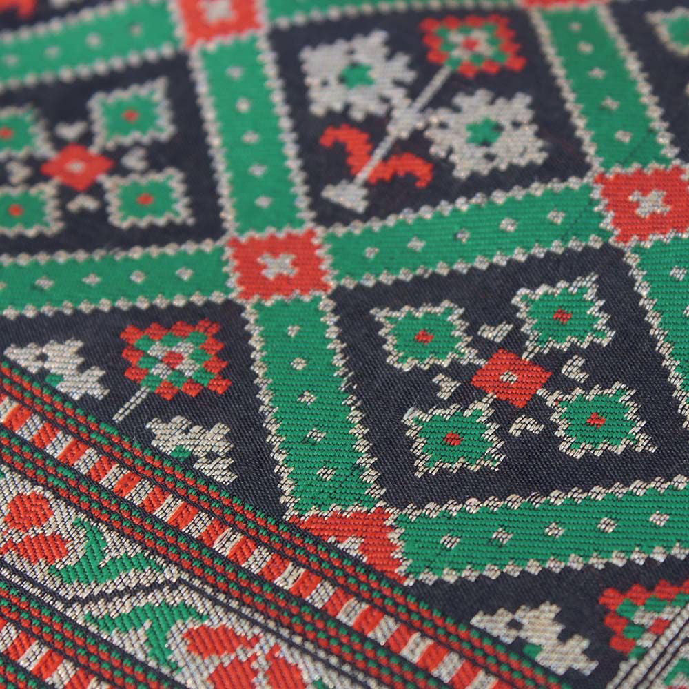 Technique - A Gujarati Patola design created using a classic handwoven Banarasi Meenakari art passed down through generations. Meenakari involves the painstaking addition of supplementary coloured resham threads during the hand-weaving process.