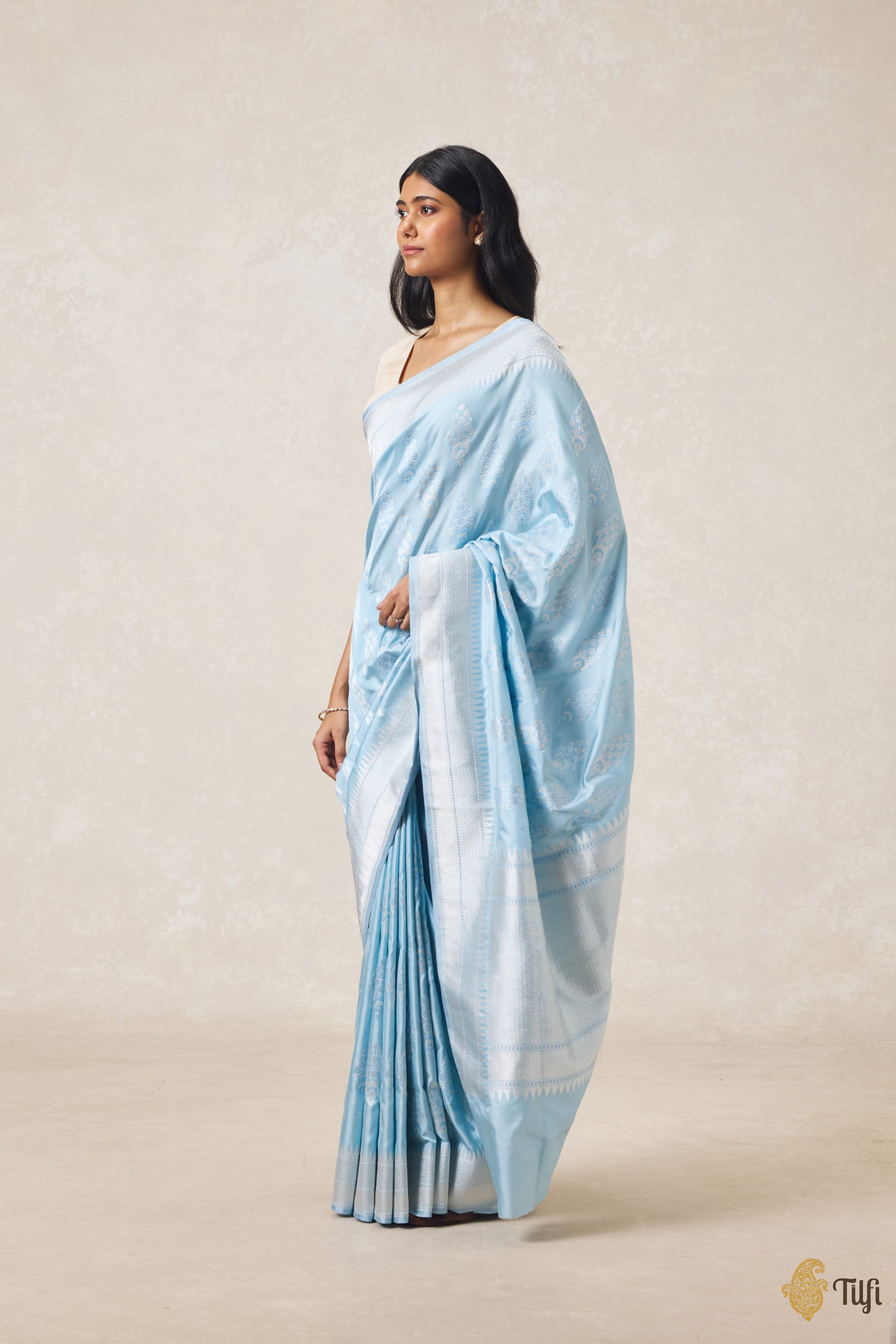 A sublime Ektara weave, accompanying delightful bootas in silken meenakari woven in an elaborate kadhua weave. This handloom treasure is a distinctive and artistic piece for the discerning.