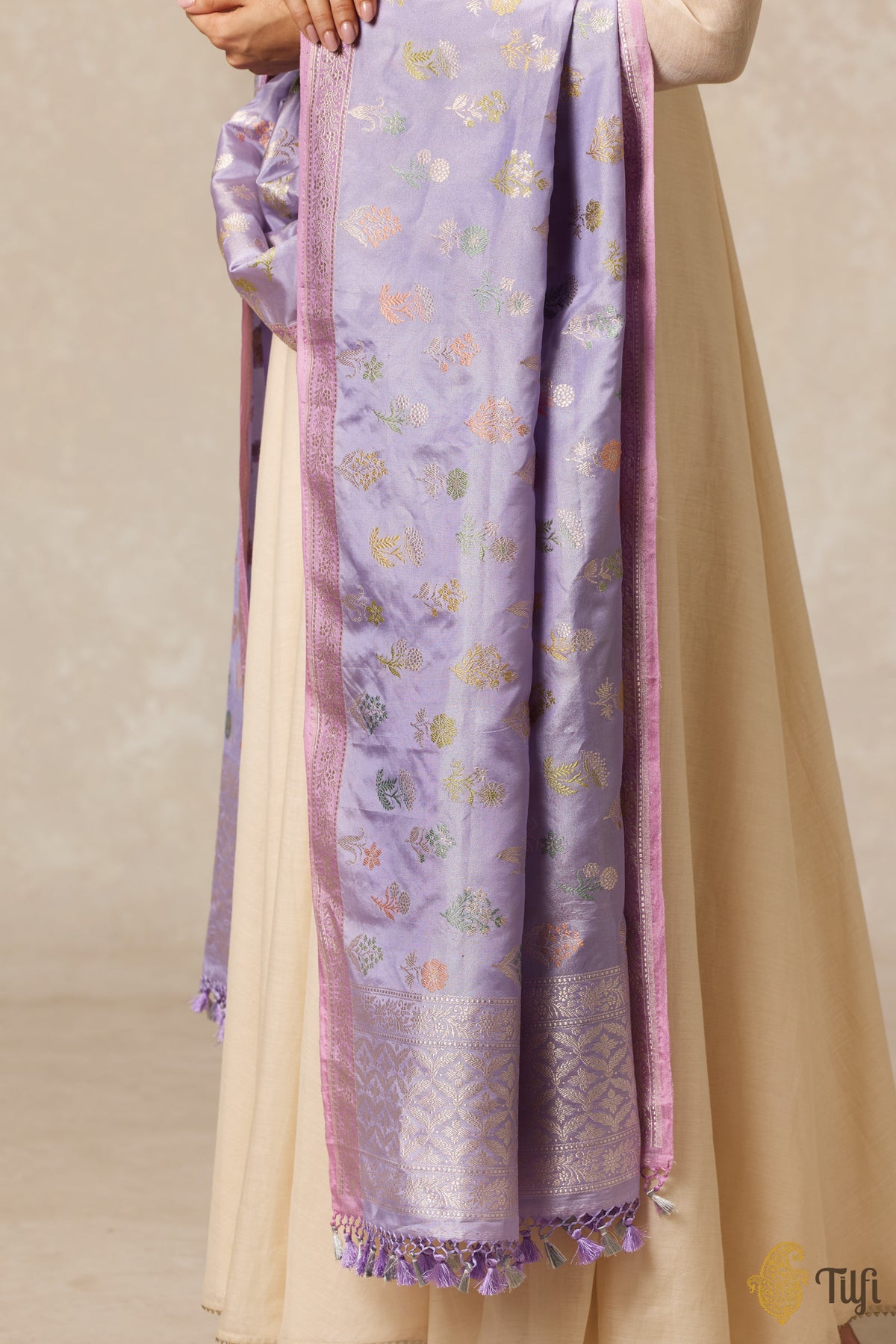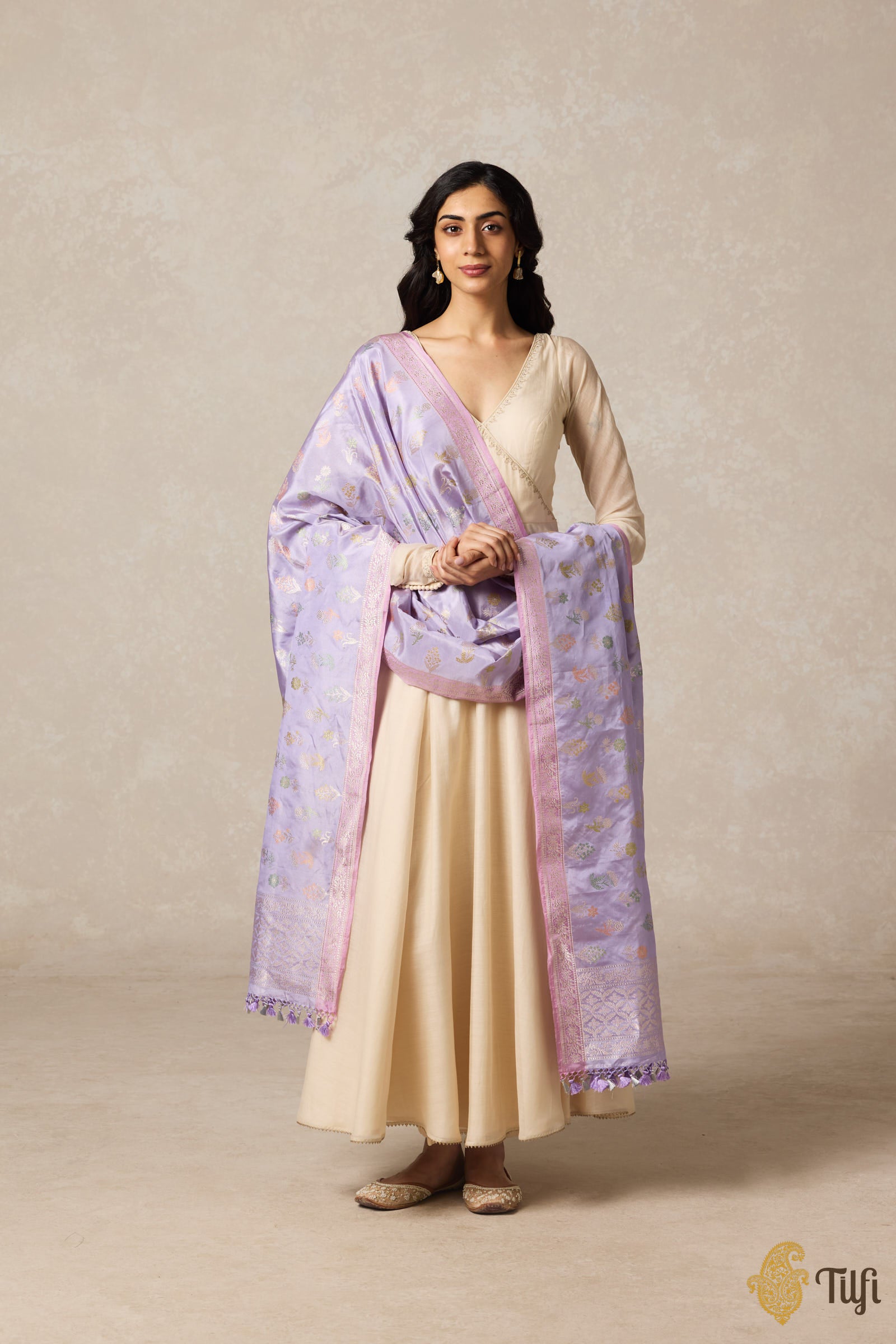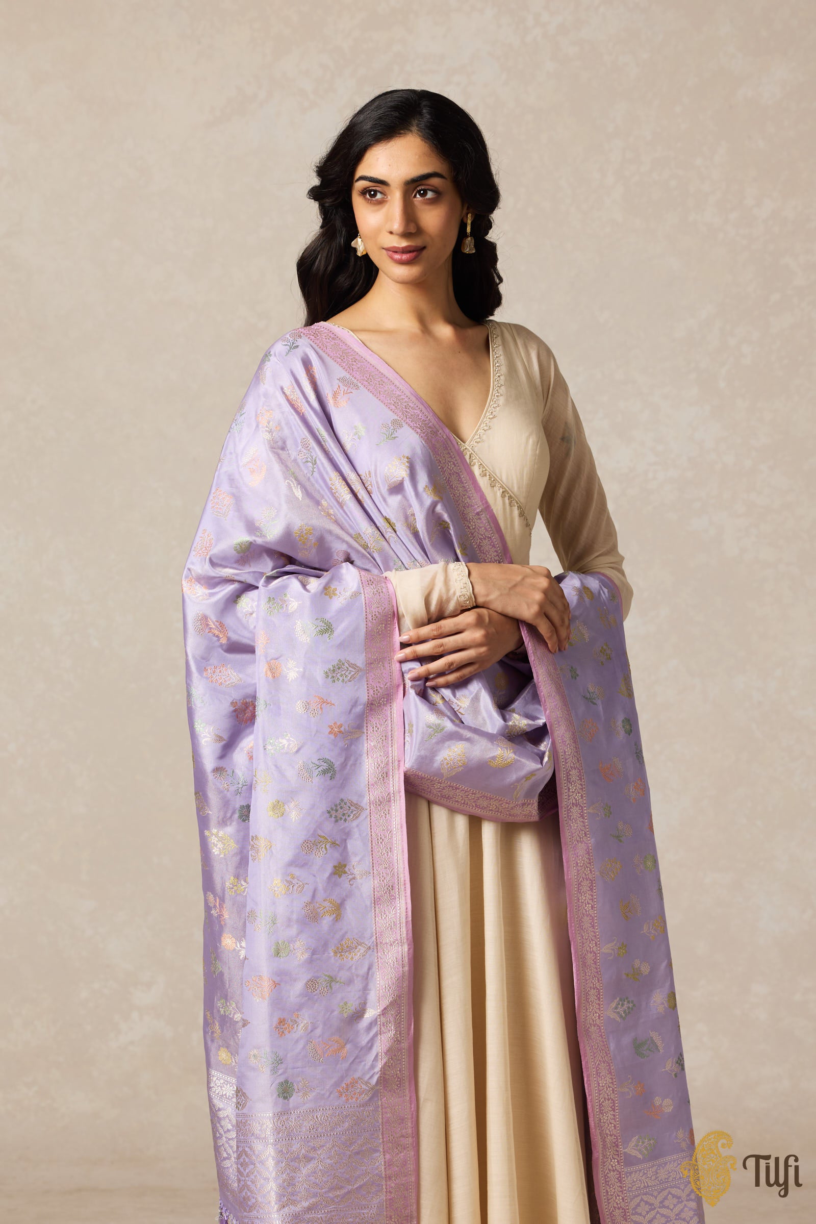 An heirloom odhani of exceptional craftsmanship. Featuring an exquisite shower of florals and botanicals in Kadhua Meenakari and silver zari on a shimmering bed of Katan silk Tissue.