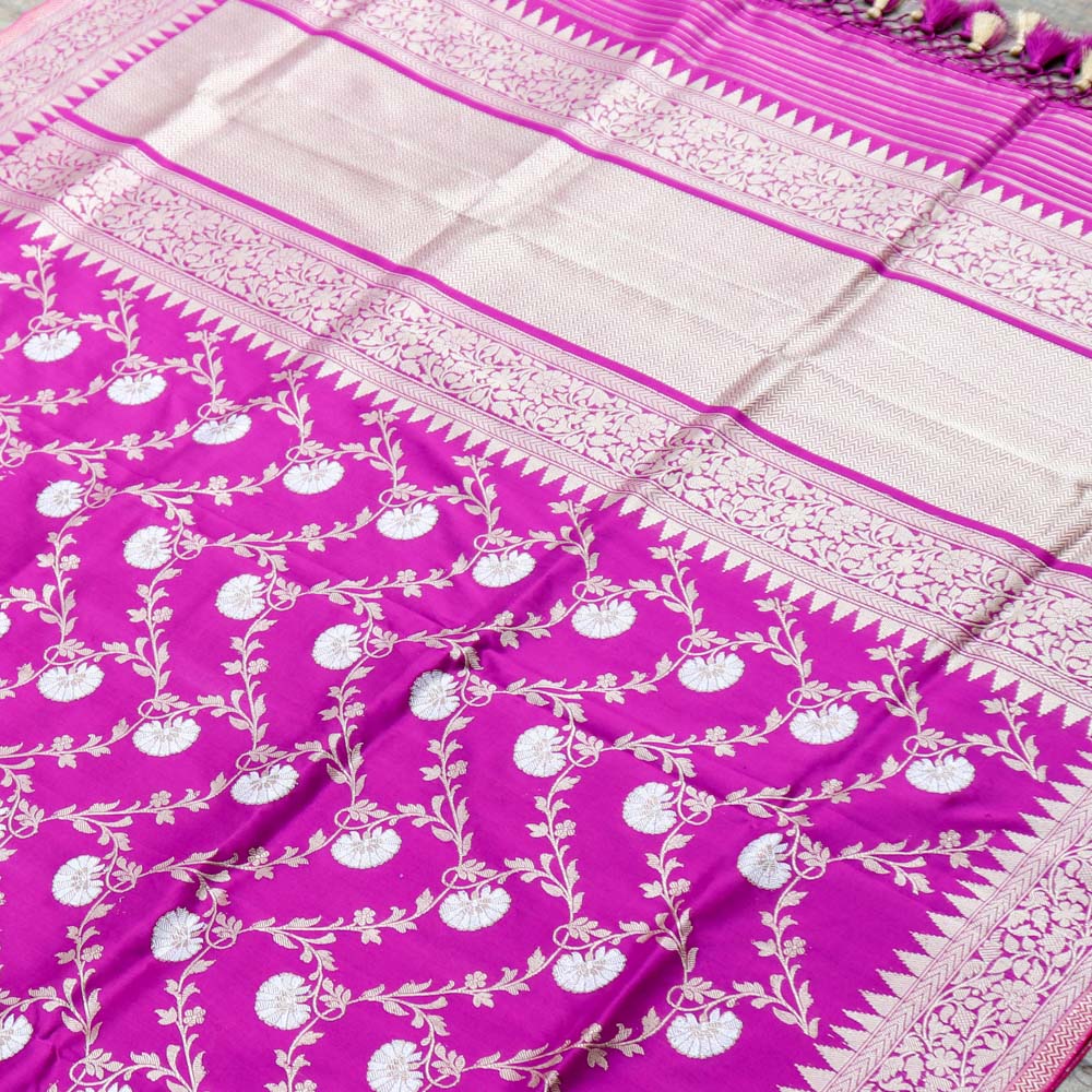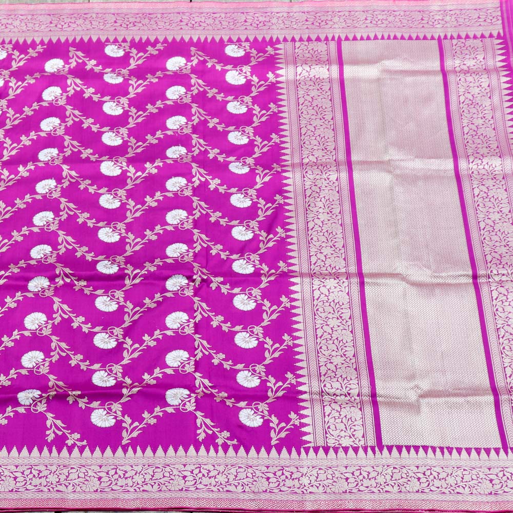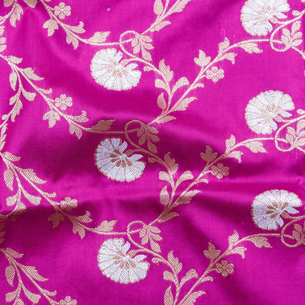 Speciality - Luxury is in the details of this handwoven masterpiece with a rich and intricate kadhua floral jaal in roopa sona zari. Breathtaking Banarasi opulence!