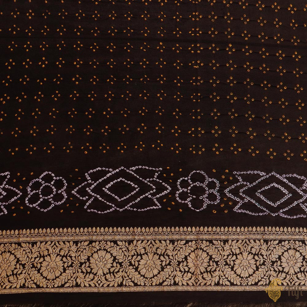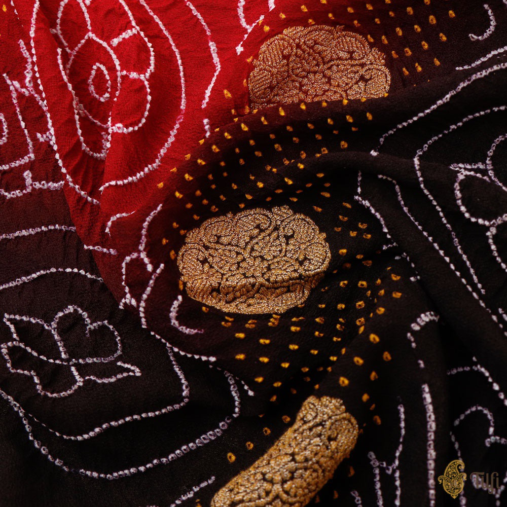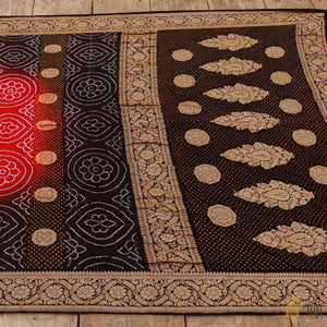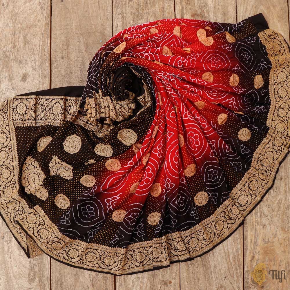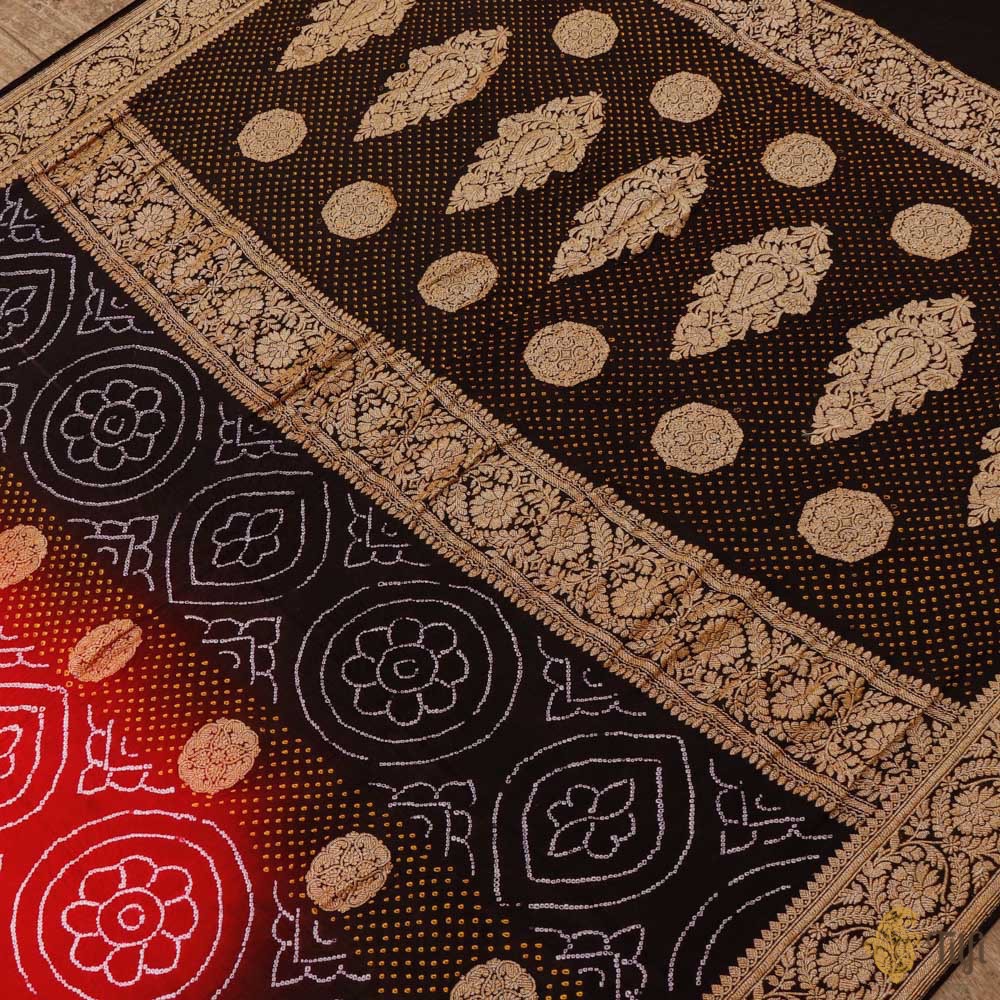 A celebration of Indian textile arts! This handwoven Banarasi saree has been hand-dyed in the classic Kutchi Bandhani technique. Kadhua zari bootas and beautiful Bandhani patterns to bring on the festive spirit!