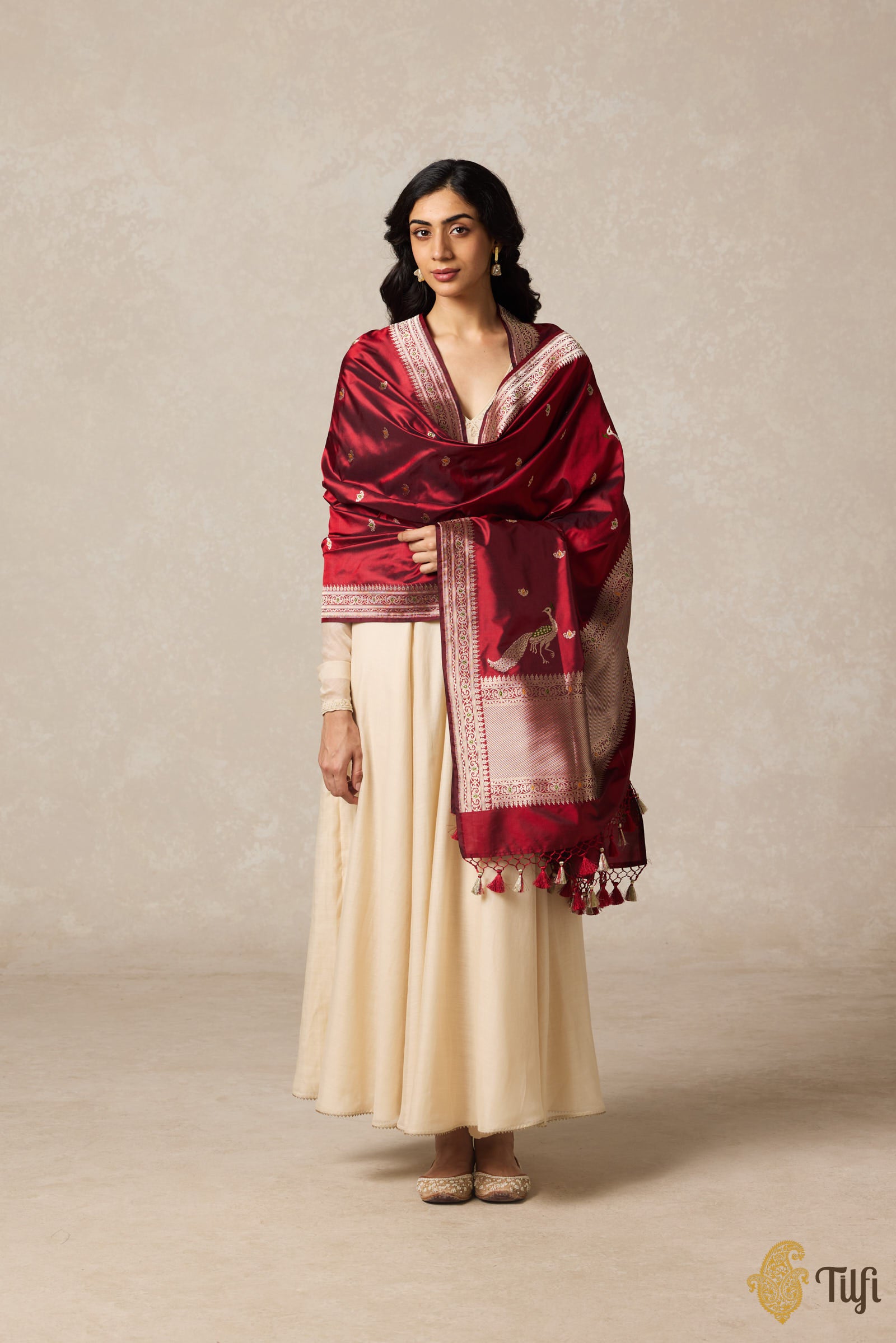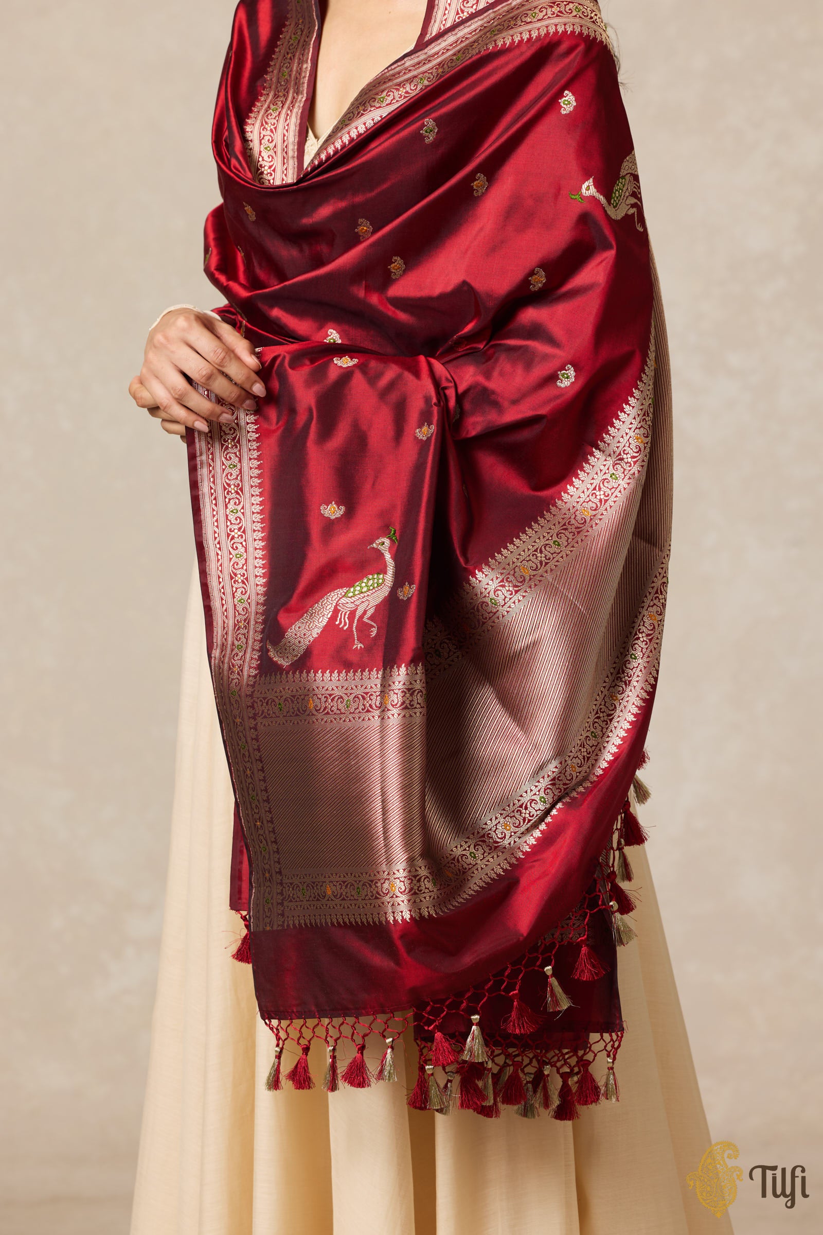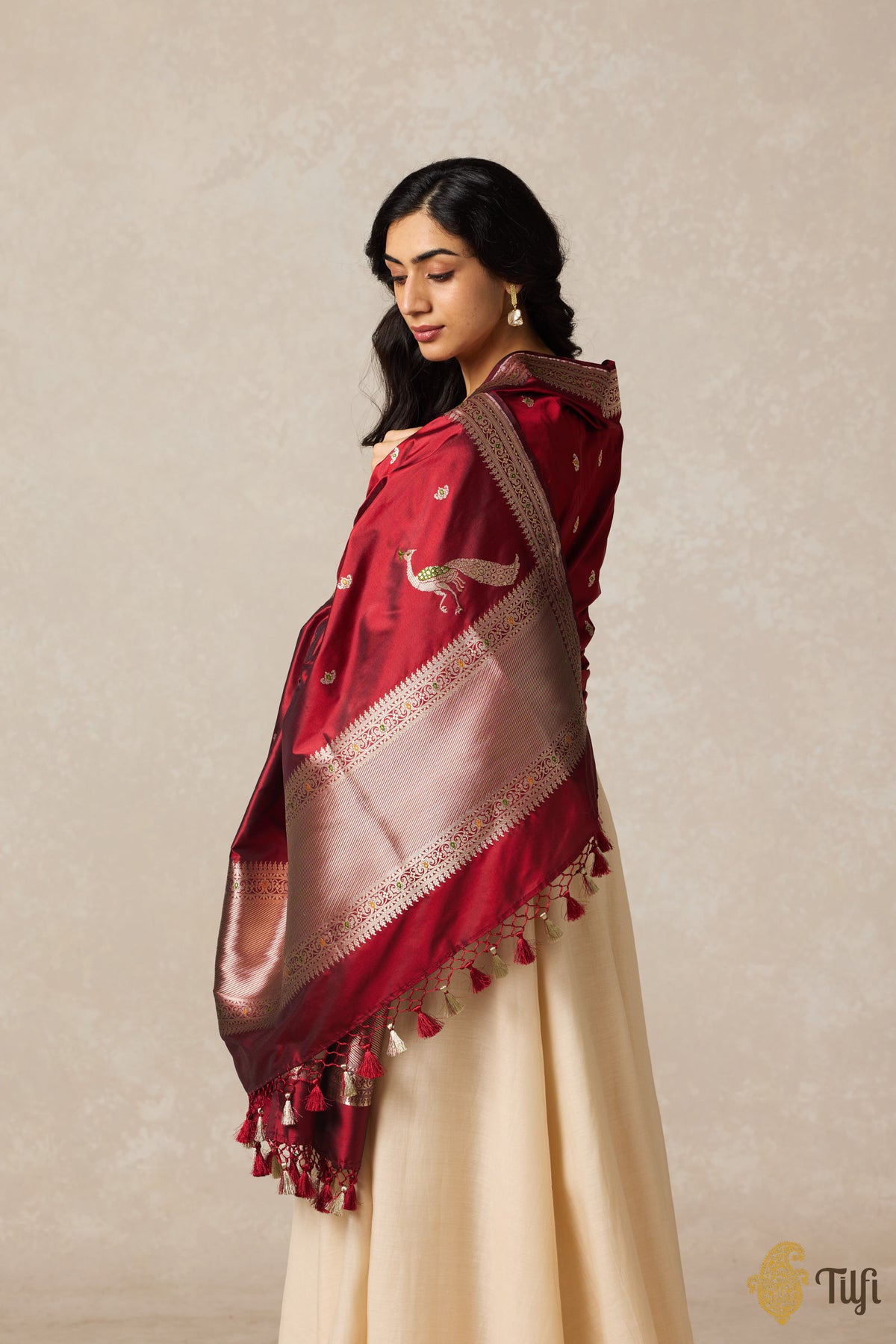 An absolutely charming silken dupatta which is the definition of vintage elegance. Delightful koniya peacocks and exquisitely crafted hints of meena in the kadhua weave - forever graceful!